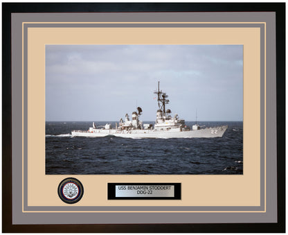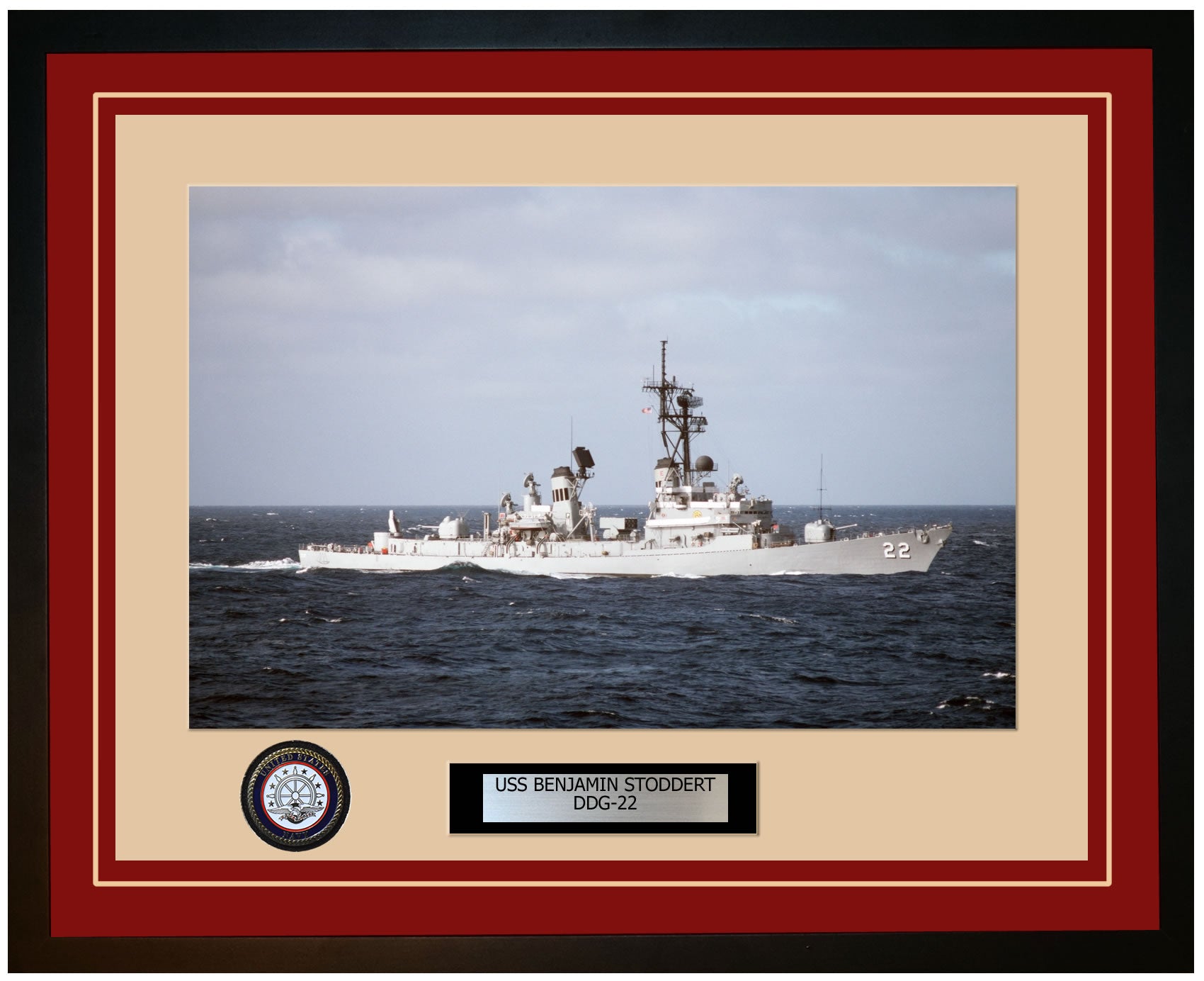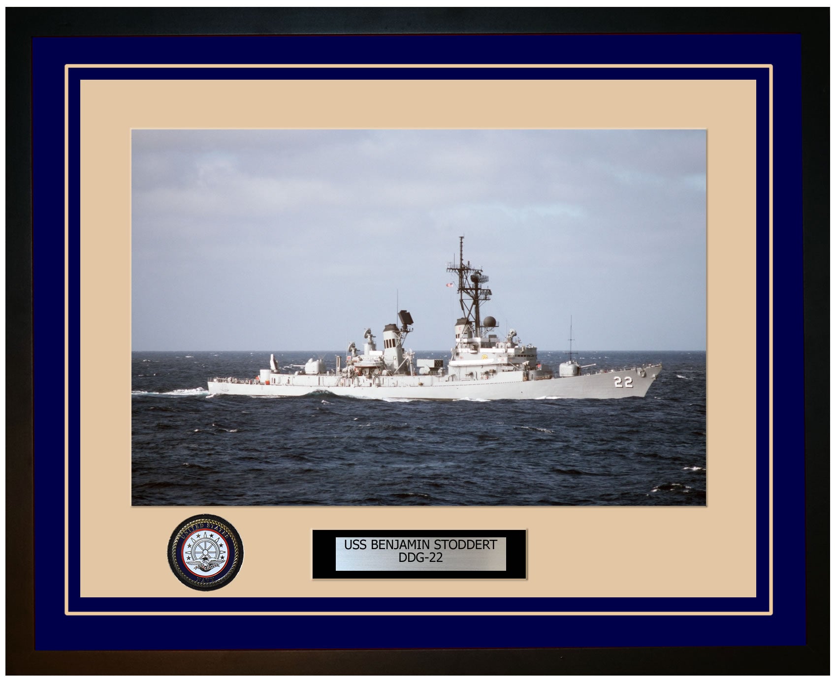 This photo of the USS BENJAMIN STODDERT (DDG-22) is framed and double matted with the highest quality construction in mind. The ship name and designation is engraved on chrome engraving stock and set on a beautiful felt backing. All this set in a custom cut fine inner mat and your choice of colors for the outer mat. The v-groove in the outer mat and custom engraving add high quality details that properly honor all the service members who served on this fine ship.