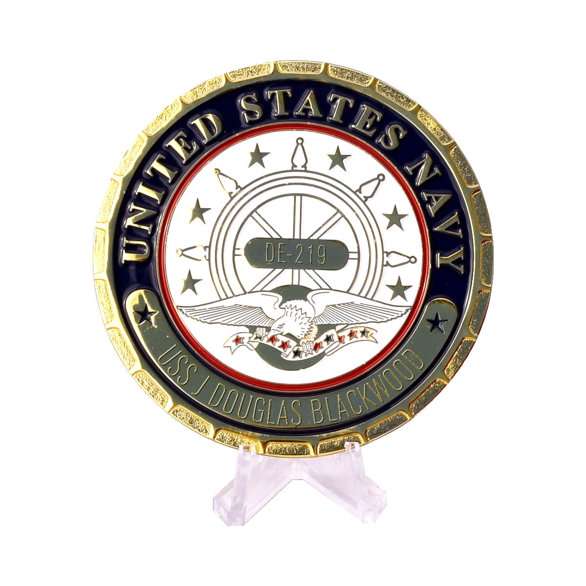 Display your Navy pride for all to see with the personalized USS J Douglas Blackwood (DE-219) Navy Ship Plaque. We are offering this premium metal plaque measuring 3" in diameter and includes an acrylic stand, high quality quilted gift box, and up to three lines of engraved personalization! Show your pride in the USS J Douglas Blackwood and your proud contribution to the freedom of our nation!