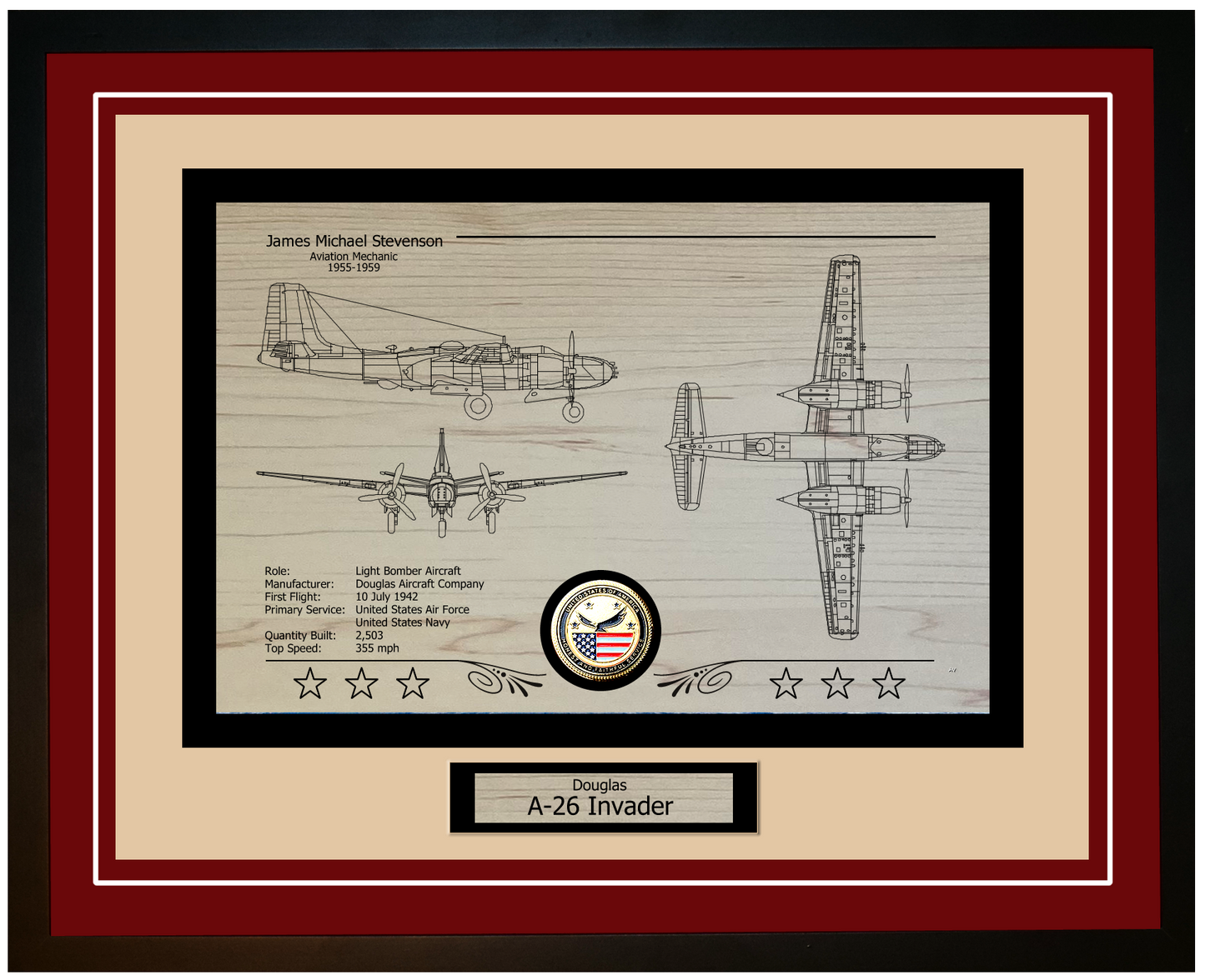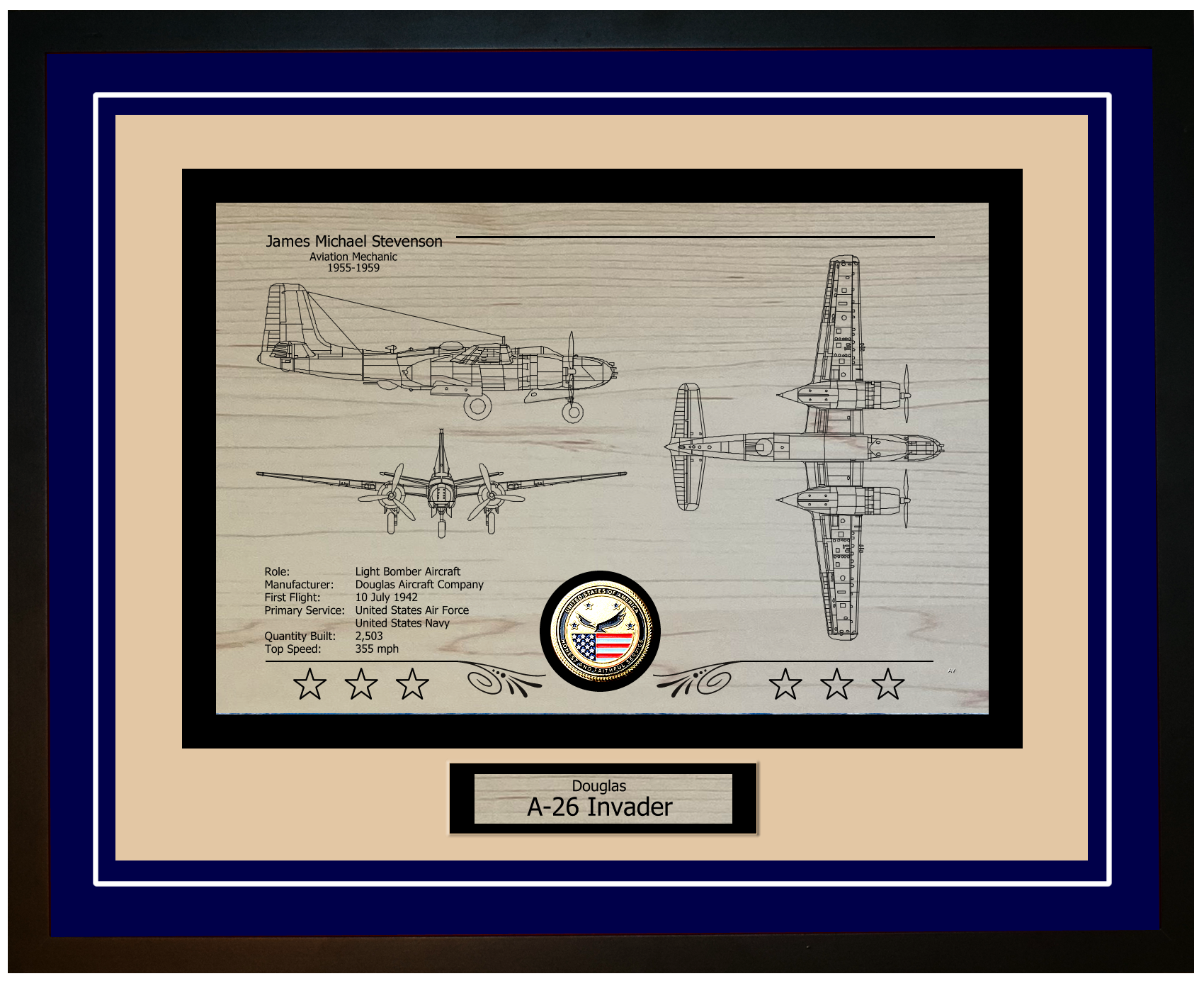 Fully engraved A-26 Invader with your custom text. This engraved A-26 art displays the aircraft from multiple views. This beautiful heirloom contains your choice of mat color as well as your custom engraved text. Inset into the engraving is our exclusive 'Honest and Faithful Service' metal crest. These words are derived from your Honorable Discharge certificate that commends you for your 'Honest and Faithful Service' to the United States of America. For Army, Navy, Air Force, Marine Corps or Coast Guard aviators, nothing honors your commitment to our freedom like these commemorative displays. Don't wait countless weeks for delivery. We are awaiting your order and personalization (UP TO 3 LINES OF CUSTOM TEXT ENGRAVING FOR FREE) to get this completed for you right away. We always ship within 5 business days!