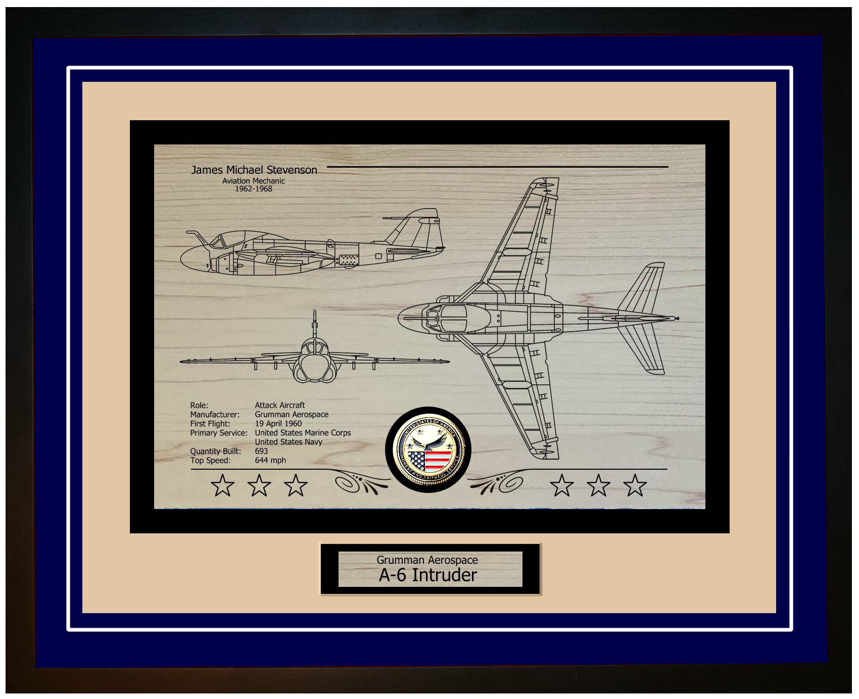 Fully engraved A-6 Intruder with your custom text. This engraved A-6 art displays the aircraft from multiple views. This beautiful heirloom contains your choice of mat color as well as your custom engraved text. Inset into the engraving is our exclusive 'Honest and Faithful Service' metal crest. These words are derived from your Honorable Discharge certificate that commends you for your 'Honest and Faithful Service' to the United States of America. For Army, Navy, Air Force, Marine Corps or Coast Guard aviators, nothing honors your commitment to our freedom like these commemorative displays. Don't wait countless weeks for delivery. We are awaiting your order and personalization (UP TO 3 LINES OF CUSTOM TEXT ENGRAVING FOR FREE) to get this completed for you right away. We always ship within 5 business days! art displays the aircraft from multiple views. This beautiful heirloom contains your choice of mat color as well as your custom engraved text. Inset into the engraving is our exclusive 'Honest and Faithful Service' metal crest. These words are derived from your Honorable Discharge certificate that commends you for your 'Honest and Faithful Service' to the United States of America. For Army, Navy, Air Force, Marine Corps or Coast Guard aviators, nothing honors your commitment to our freedom like these commemorative displays. Don't wait countless weeks for delivery. We are awaiting your order and personalization (UP TO 3 LINES OF CUSTOM TEXT ENGRAVING FOR FREE) to get this completed for you right away. We always ship within 5 business days!