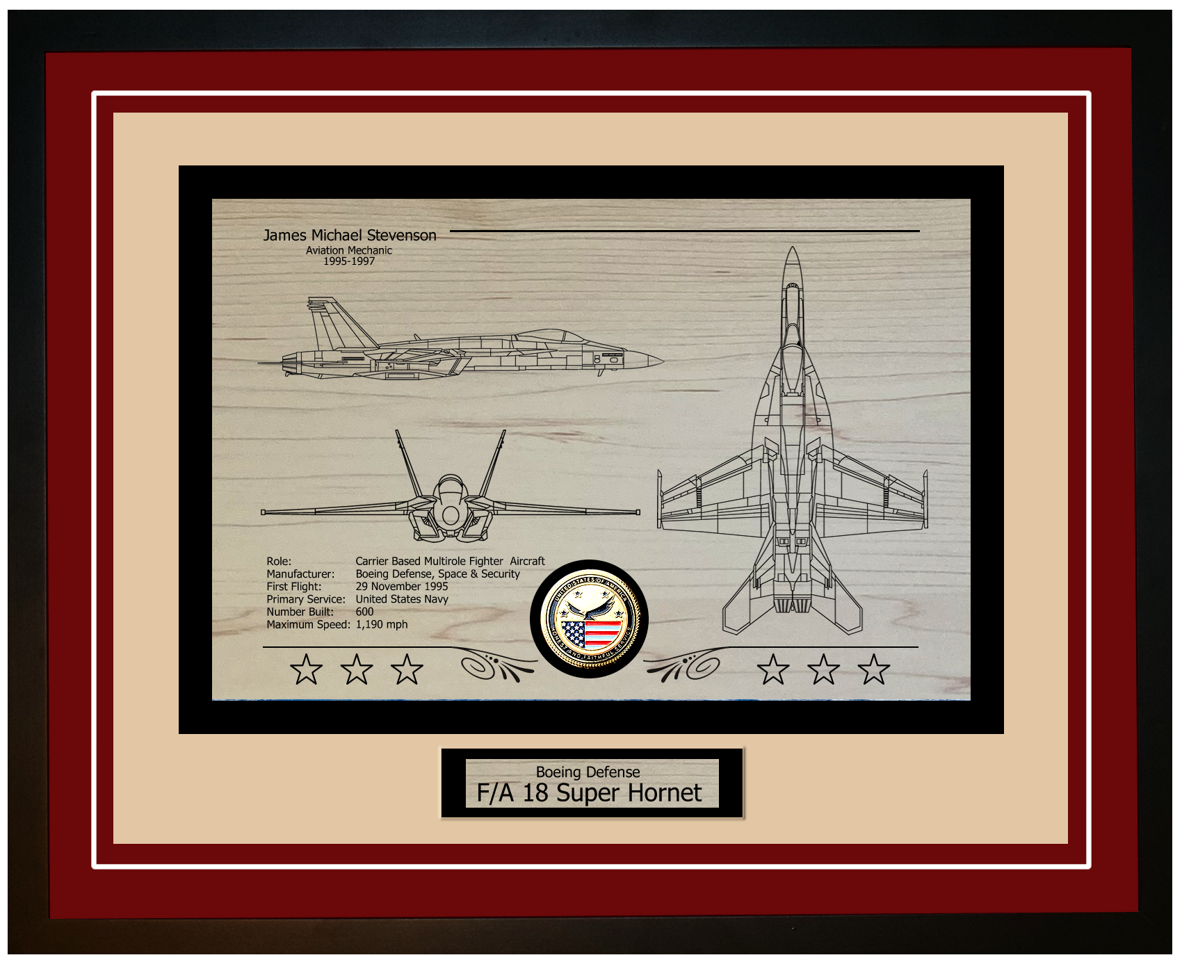 Fully engraved FA-18 Super-Hornet with your custom text. This engraved FA-18 art displays the aircraft from multiple views. This beautiful heirloom contains your choice of mat color as well as your custom engraved text. Inset into the engraving is our exclusive 'Honest and Faithful Service' metal crest. These words are derived from your Honorable Discharge certificate that commends you for your 'Honest and Faithful Service' to the United States of America. For Army, Navy, Air Force, Marine Corps or Coast Guard aviators, nothing honors your commitment to our freedom like these commemorative displays. Don't wait countless weeks for delivery. We are awaiting your order and personalization (UP TO 3 LINES OF CUSTOM TEXT ENGRAVING FOR FREE) to get this completed for you right away. We always ship within 5 business days!
