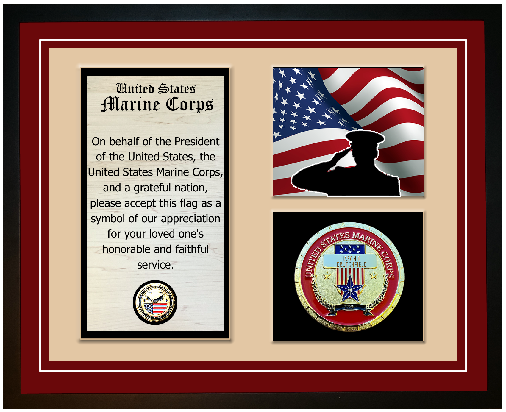 The custom plaques and incredible engravings make this Marine Corps Veteran display an incredible way to honor a veteran that has contributed 'Honest and Faithful Service' to our great country! This beautiful heirloom contains your choice of mat color and includes the servicemember name engraved on the custom Marine Corps plaque.