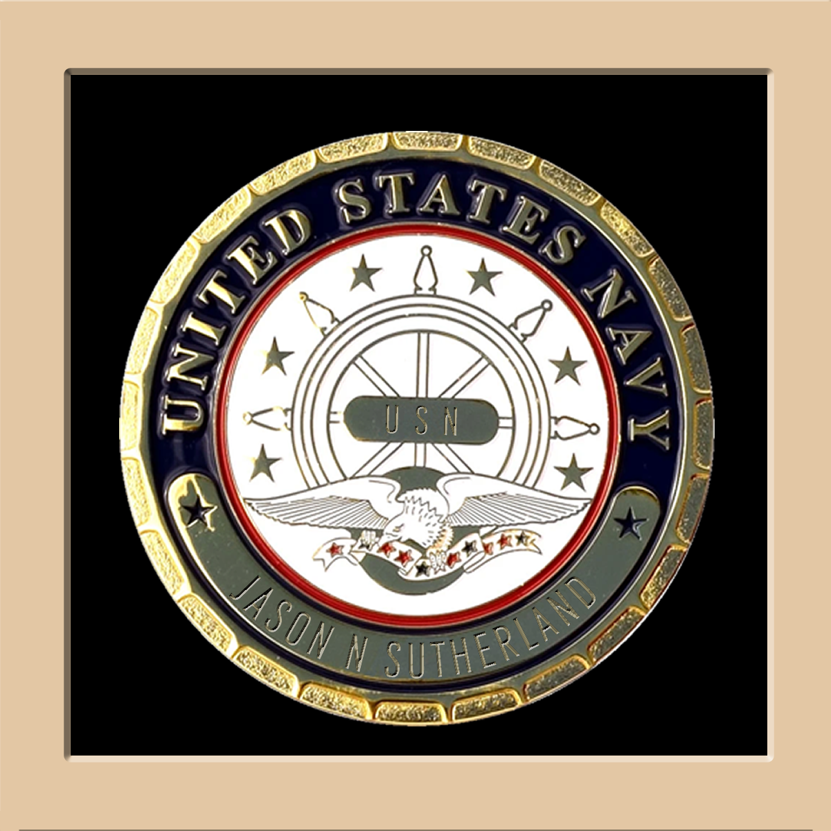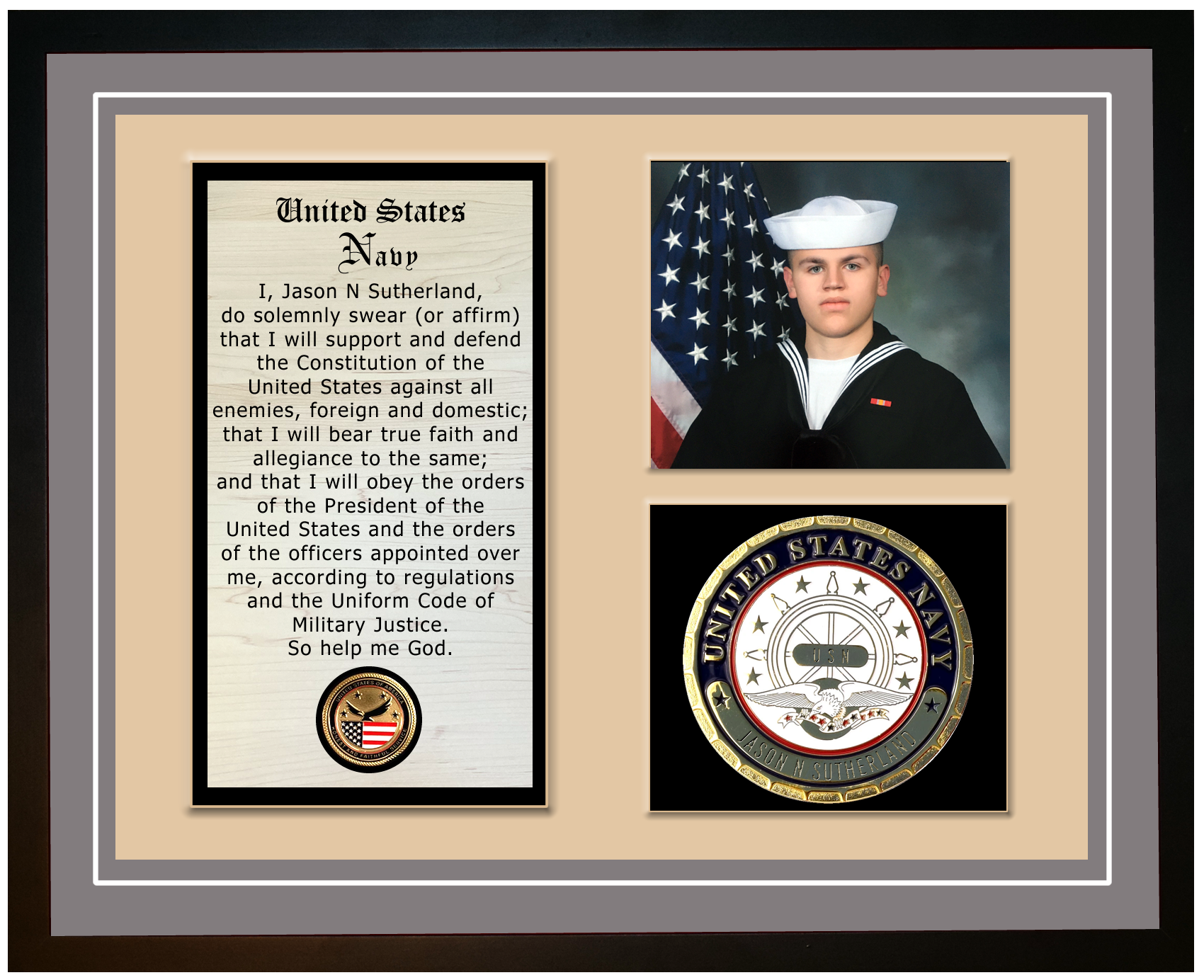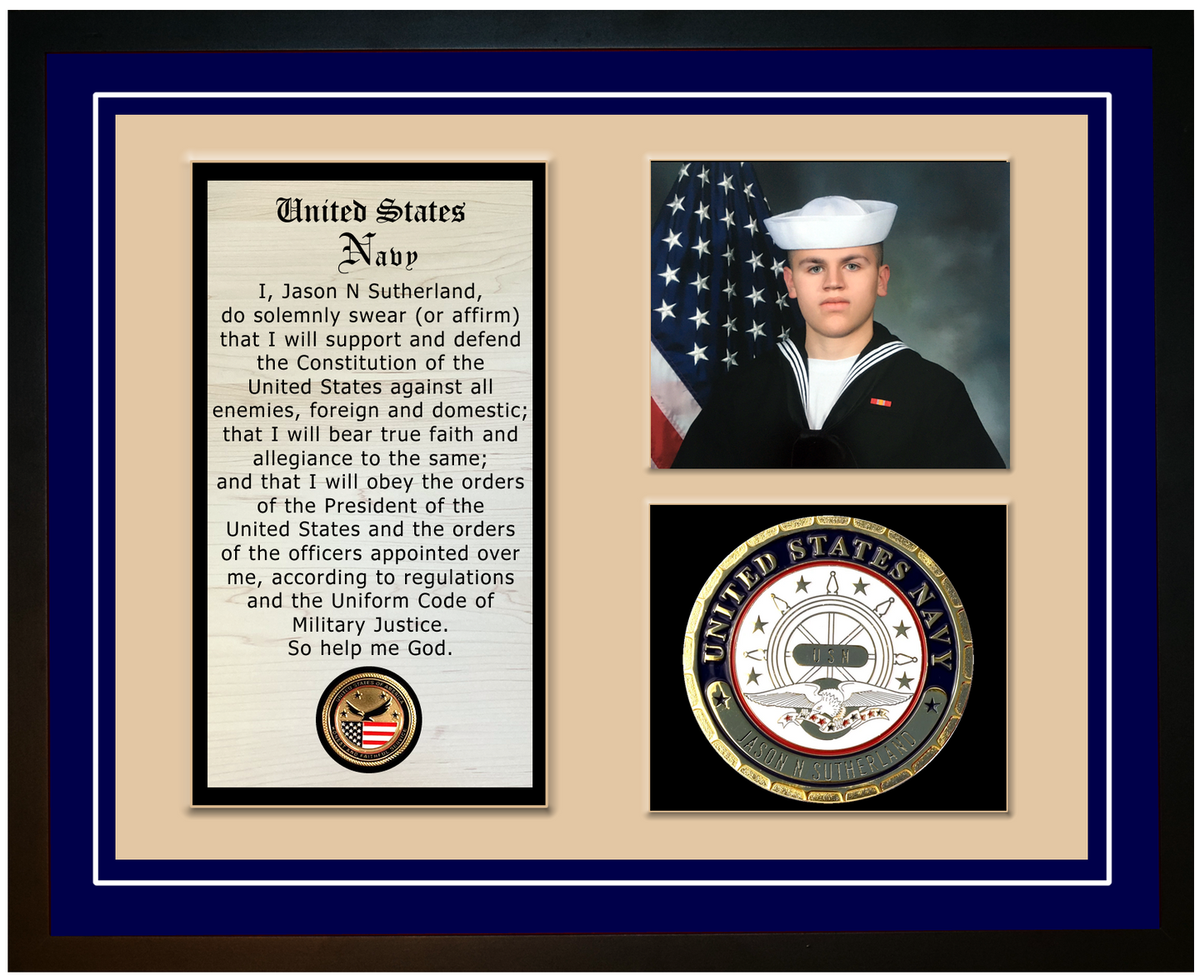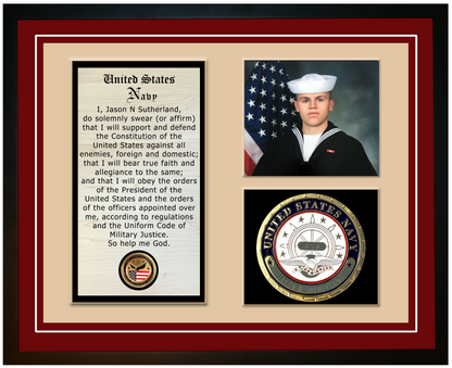 The custom plaques and incredible engravings make this Navy Veteran display an incredible way to honor a veteran that has contributed 'Honest and Faithful Service' to our great country!   This beautiful heirloom contains your choice of mat color and includes the servicemember name engraved on the custom Navy plaque.