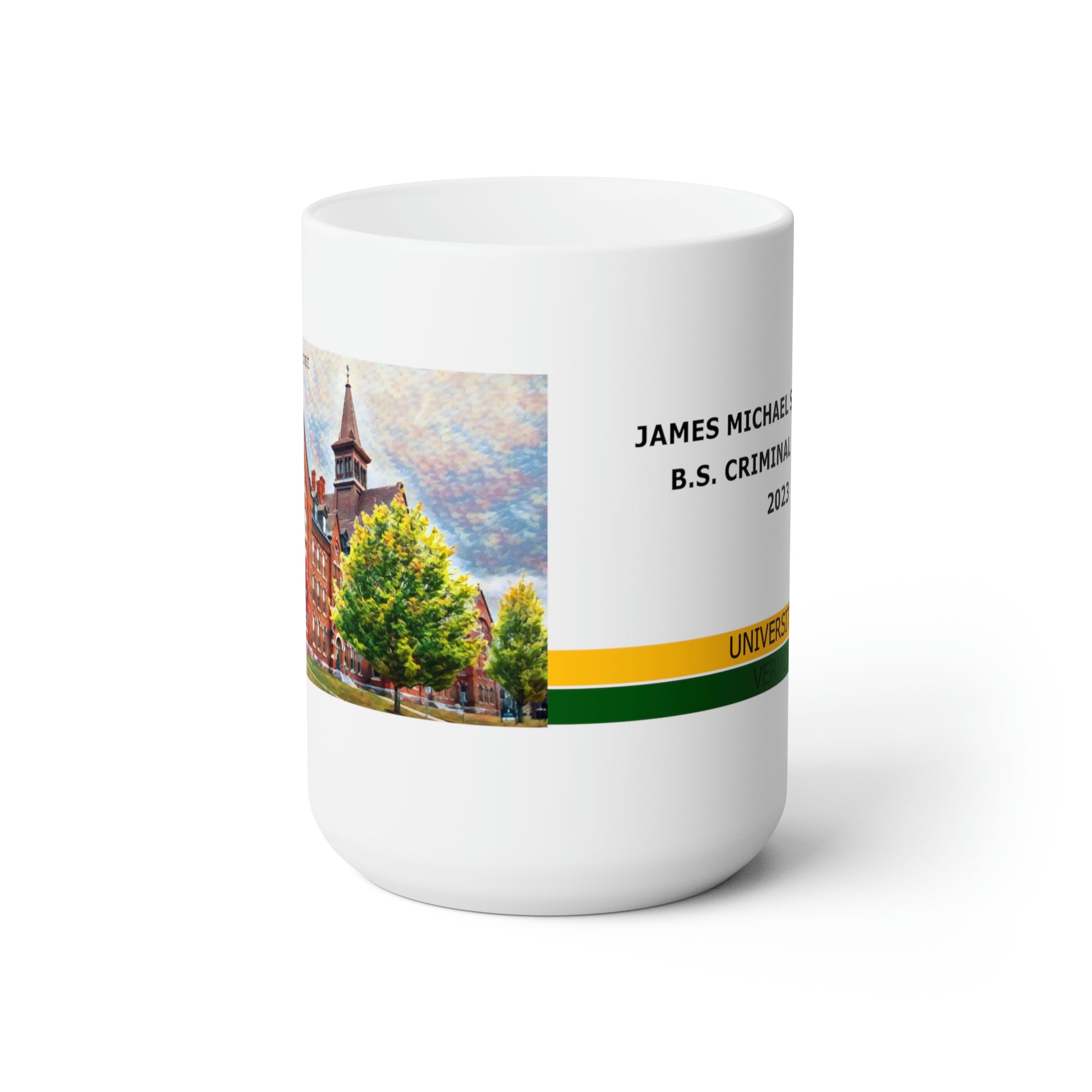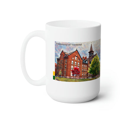 Introducing the University of Vermont Coffee Mug - the perfect addition to your morning routine! This mug features a custom art design showcasing the beautiful campus of the University of Vermont.