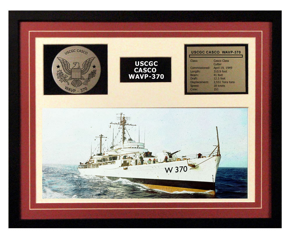 This is a beautiful ship display commemorating the USCGC Casco WAVP-370. The artwork depicts the USCGC Casco WAVP-370 in all her glory. More than just an artist conception of the ship, this display includes a custom designed Coast Guard crest plaque and an engraved ship statistics plaque. This product is richly finished with custom cut and sized double mats and framed with a high quality black frame. Only the best materials are used to complete our ship displays. Our Ship Displays make a generous and personal gift for any Coast Guard sailor.