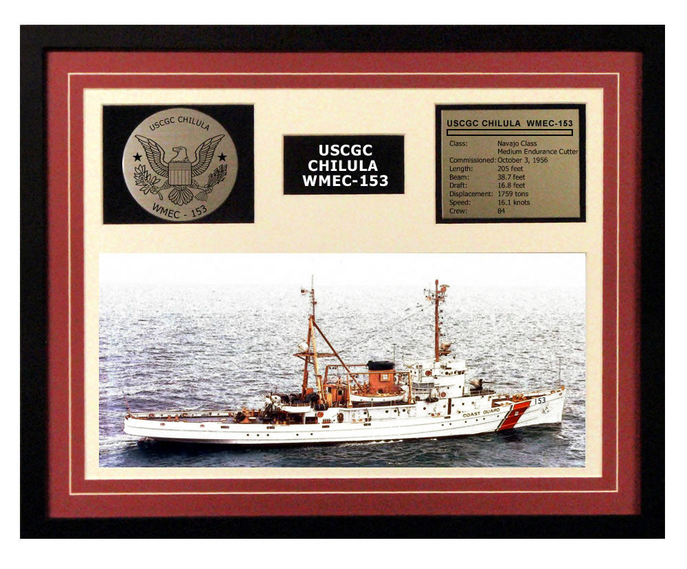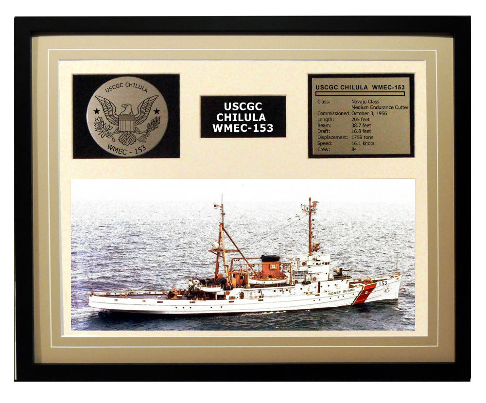 This is a beautiful ship display commemorating the USCGC Chilula WMEC-153. The artwork depicts the USCGC Chilula WMEC-153 in all her glory. More than just an artist conception of the ship, this display includes a custom designed Coast Guard crest plaque and an engraved ship statistics plaque. This product is richly finished with custom cut and sized double mats and framed with a high quality black frame. Only the best materials are used to complete our ship displays. Our Ship Displays make a generous and personal gift for any Coast Guard sailor.