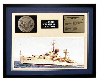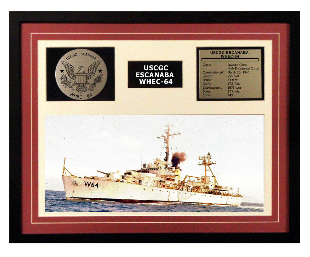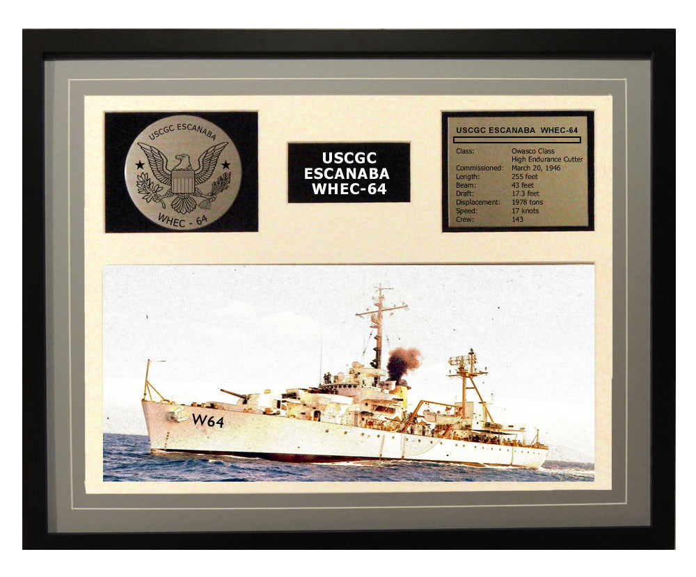 This is a beautiful ship display commemorating the USCGC Escanaba WHEC-64. The artwork depicts the USCGC Escanaba WHEC-64 in all her glory. More than just an artist conception of the ship, this display includes a custom designed Coast Guard crest plaque and an engraved ship statistics plaque. This product is richly finished with custom cut and sized double mats and framed with a high quality black frame. Only the best materials are used to complete our ship displays. Our Ship Displays make a generous and personal gift for any Coast Guard sailor.