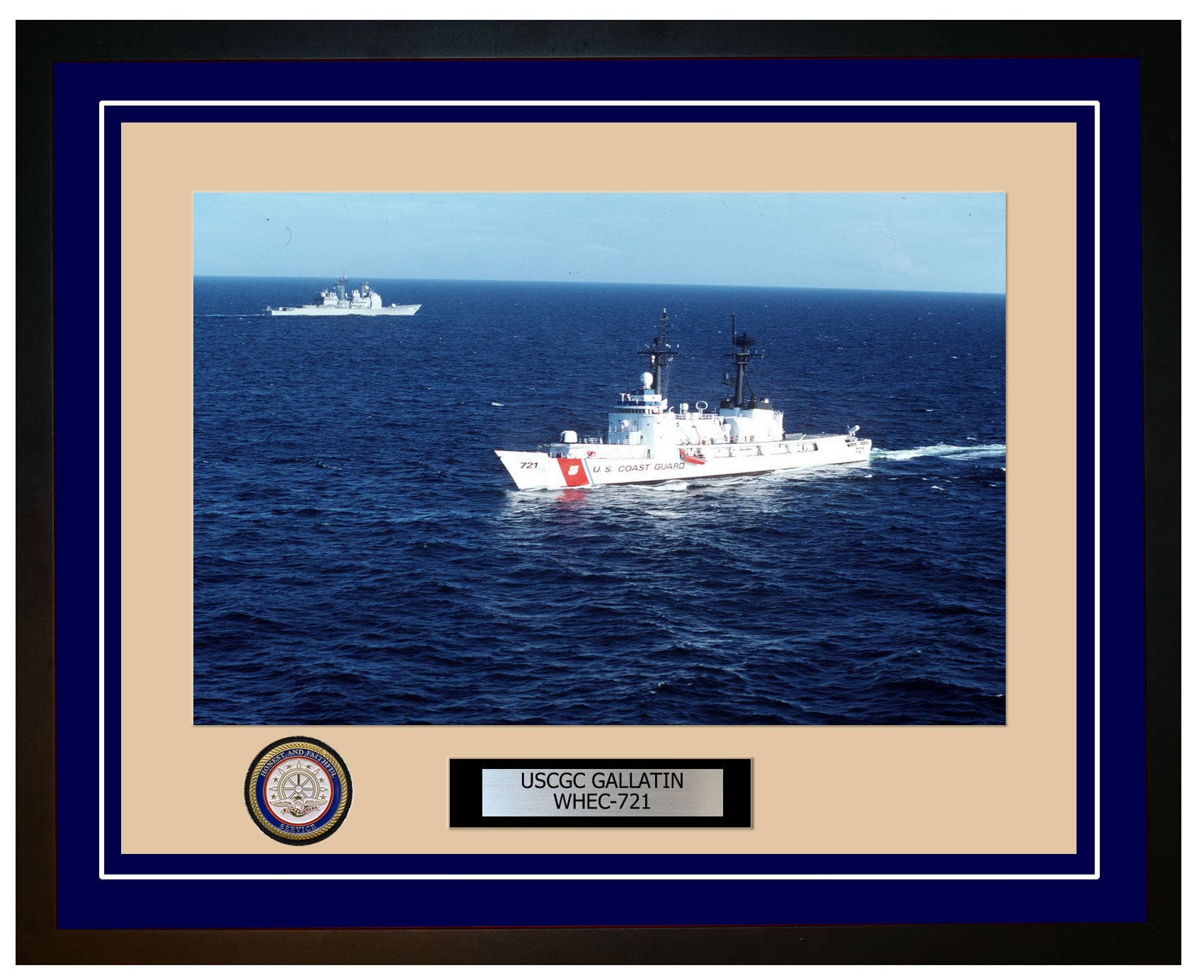 This photo of the USCGC GALLATIN WHEC-721 is framed and double matted with the highest quality construction in mind. The ship name and designation is engraved on chrome engraving stock and set on a beautiful felt backing. All this set in a custom cut fine inner mat and your choice of colors for the outer mat. The v-groove in the outer mat and custom engraving add high quality details that properly honor all the service members who served on this fine ship.