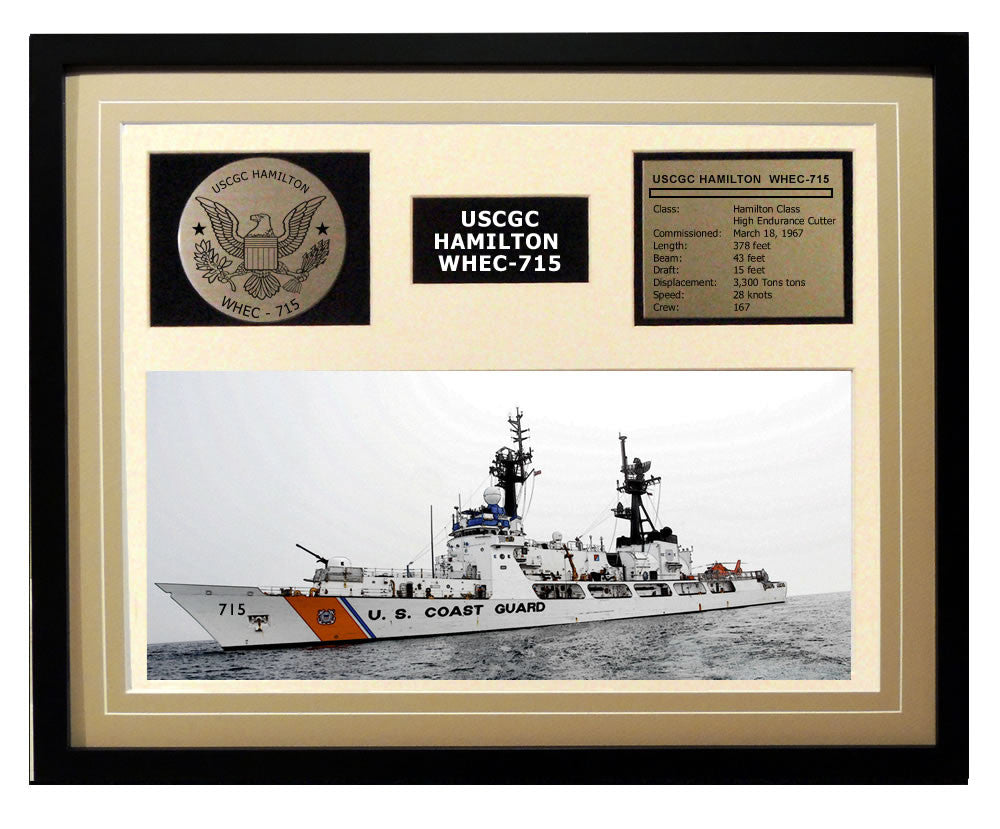 This is a beautiful ship display commemorating the USCGC Hamilton WHEC-715. The artwork depicts the USCGC Hamilton WHEC-715 in all her glory. More than just an artist conception of the ship, this display includes a custom designed Coast Guard crest plaque and an engraved ship statistics plaque. This product is richly finished with custom cut and sized double mats and framed with a high quality black frame. Only the best materials are used to complete our ship displays. Our Ship Displays make a generous and personal gift for any Coast Guard sailor.