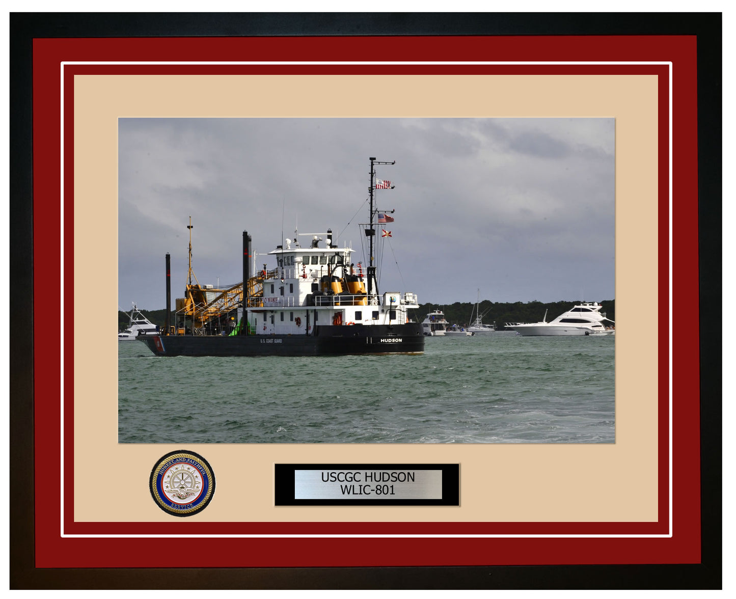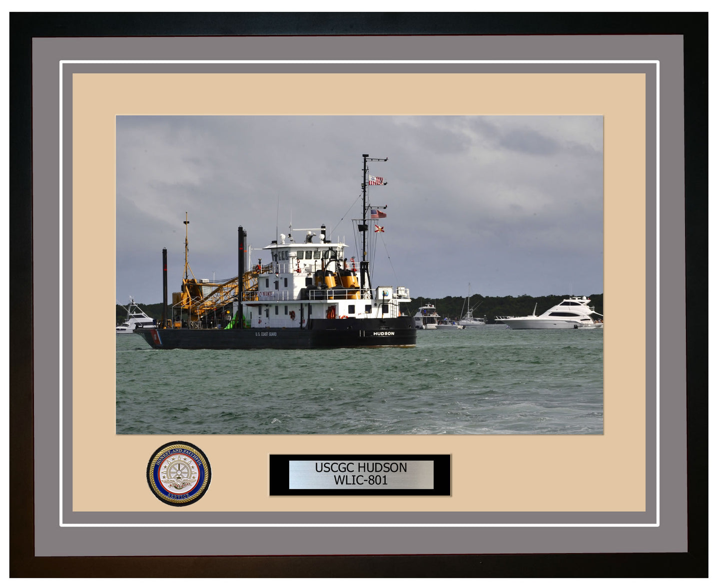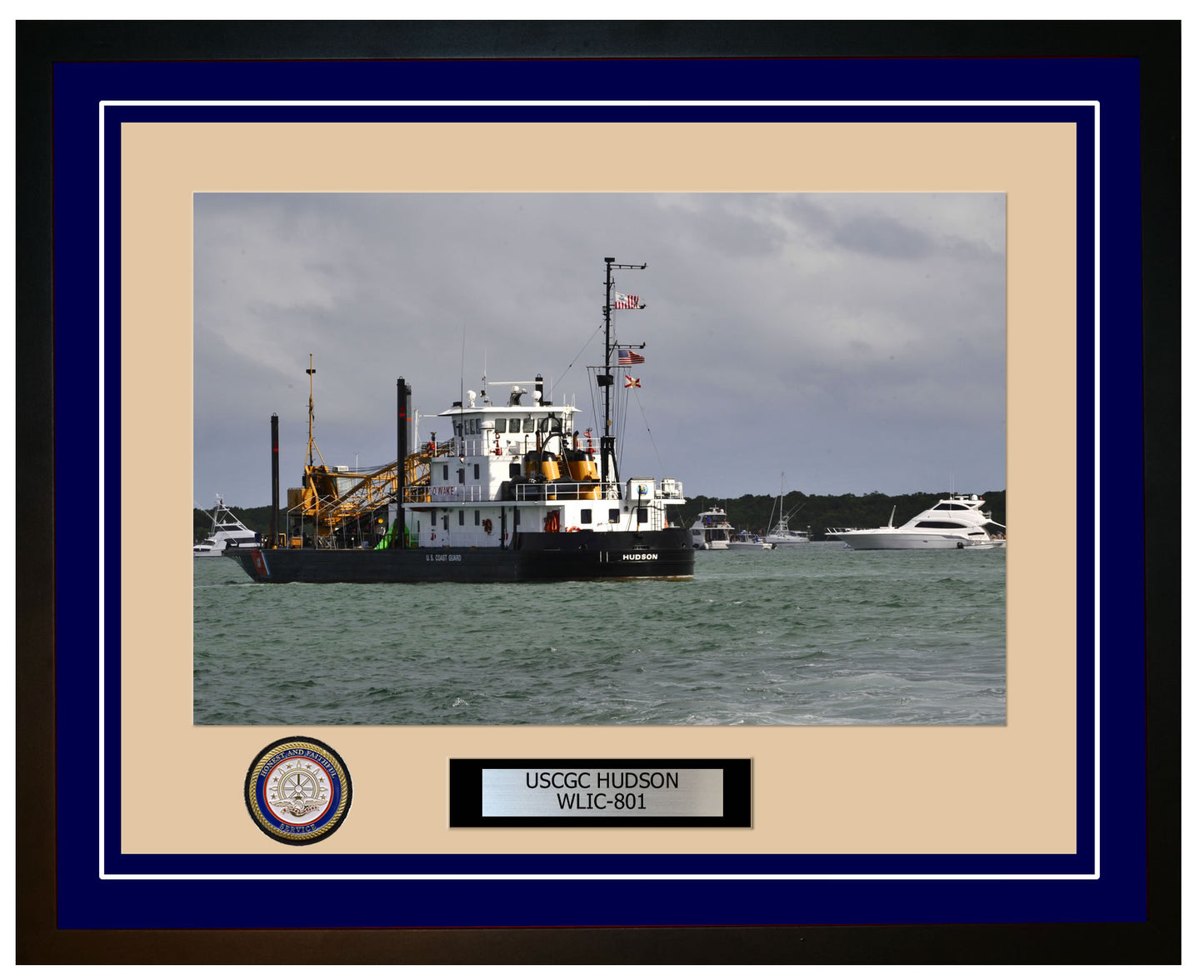 This photo of the USCGC HUDSON WLIC-801 is framed and double matted with the highest quality construction in mind. The ship name and designation is engraved on chrome engraving stock and set on a beautiful felt backing. All this set in a custom cut fine inner mat and your choice of colors for the outer mat. The v-groove in the outer mat and custom engraving add high quality details that properly honor all the service members who served on this fine ship.