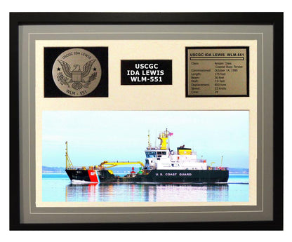 This is a beautiful ship display commemorating the USCGC Ida Lewis WLM-551. The artwork depicts the USCGC Ida Lewis WLM-551 in all her glory. More than just an artist conception of the ship, this display includes a custom designed Coast Guard crest plaque and an engraved ship statistics plaque. This product is richly finished with custom cut and sized double mats and framed with a high quality black frame. Only the best materials are used to complete our ship displays. Our Ship Displays make a generous and personal gift for any Coast Guard sailor.