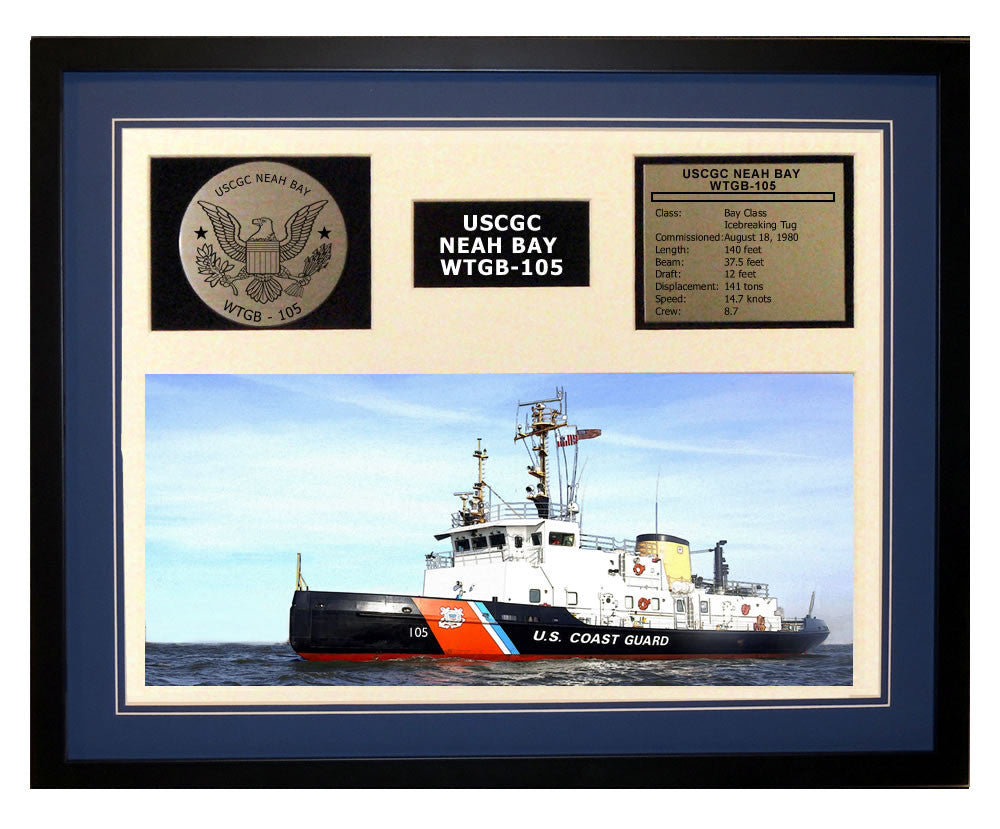 This is a beautiful ship display commemorating the USCGC Neah Bay WTGB-105. The artwork depicts the USCGC Neah Bay WTGB-105 in all her glory. More than just an artist conception of the ship, this display includes a custom designed Coast Guard crest plaque and an engraved ship statistics plaque. This product is richly finished with custom cut and sized double mats and framed with a high quality black frame. Only the best materials are used to complete our ship displays. Our Ship Displays make a generous and personal gift for any Coast Guard sailor.