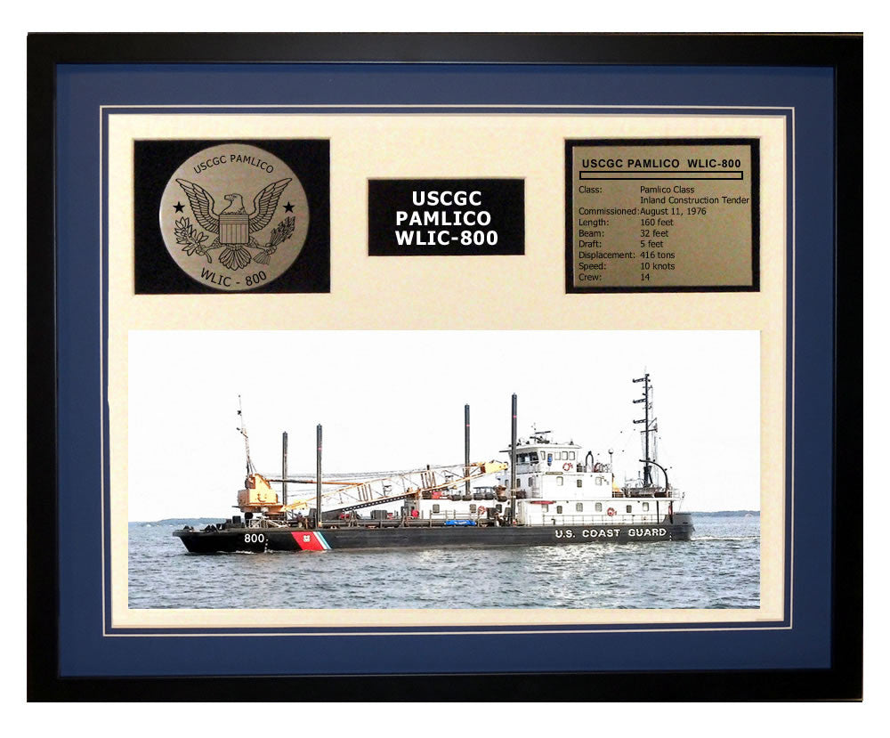 This is a beautiful ship display commemorating the USCGC Pamlico WLIC-800. The artwork depicts the USCGC Pamlico WLIC-800 in all her glory. More than just an artist conception of the ship, this display includes a custom designed Coast Guard crest plaque and an engraved ship statistics plaque. This product is richly finished with custom cut and sized double mats and framed with a high quality black frame. Only the best materials are used to complete our ship displays. Our Ship Displays make a generous and personal gift for any Coast Guard sailor.