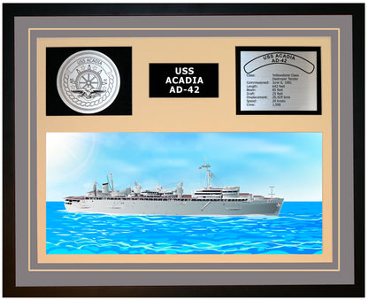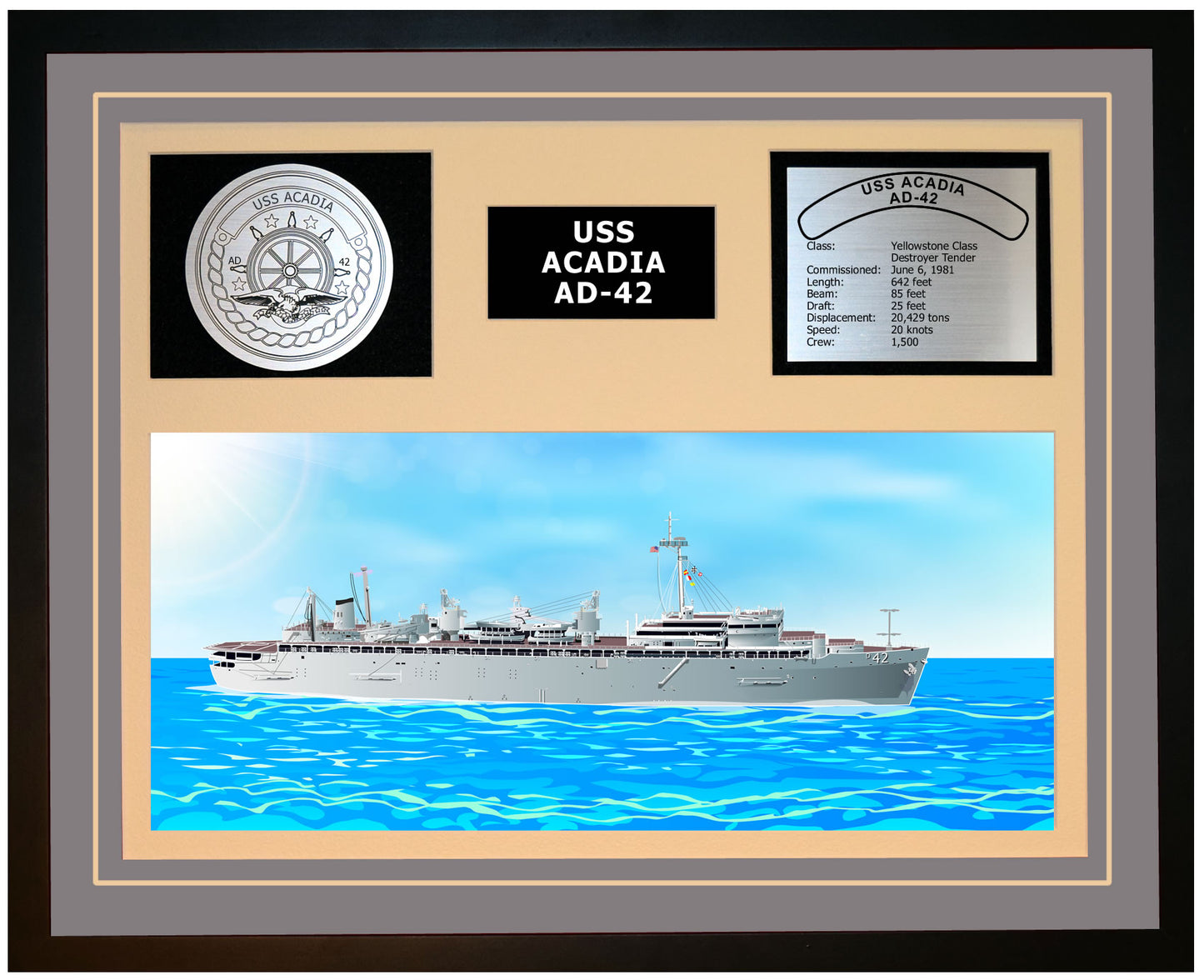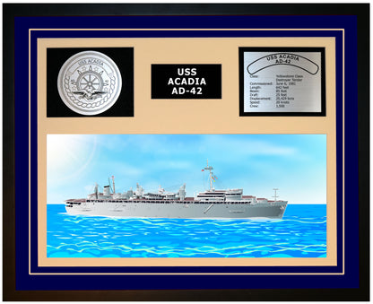 This is a beautiful ship display commemorating the USS ACADIA (AD-42). The artwork depicts the USS ACADIA in all her glory. More than just an artistic concept of the ship, this display includes a custom designed ship crest plaque and an engraved ship statistics plaque. This product is richly finished with custom cut and sized double mats and framed with a high quality black frame. Only the best materials are used to complete our ship displays. Navy Emporium Ship Displays make a generous and personal gift for any Navy sailor.
