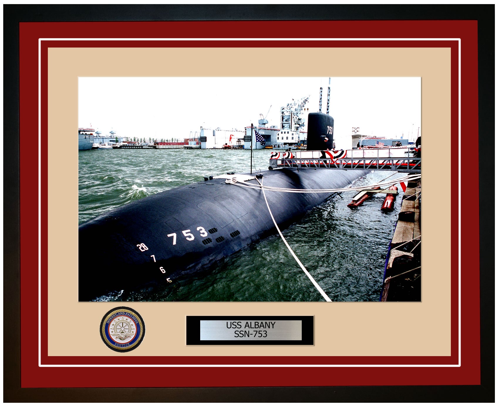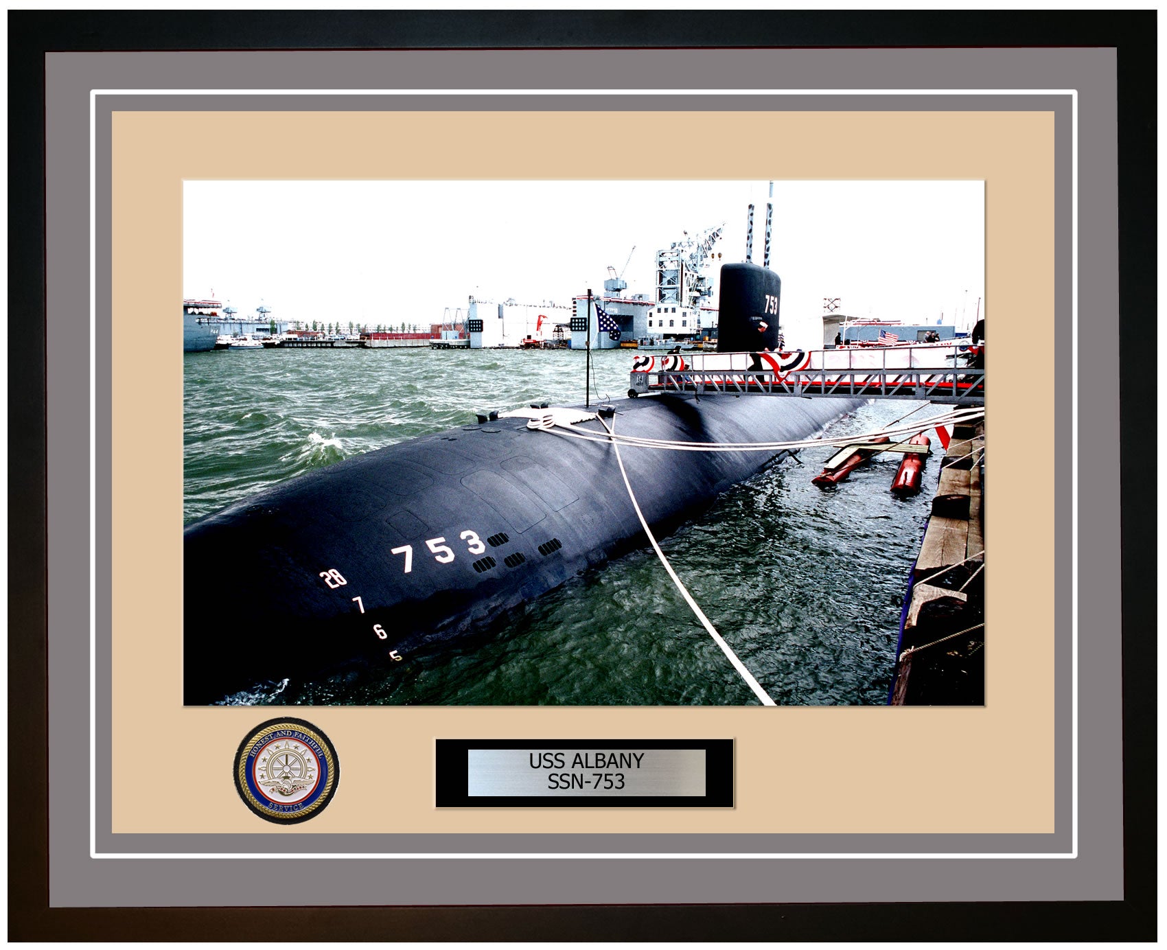 This photo of the USS Albany SSN 753 is framed and double matted with the highest quality construction in mind. The ship name and designation is engraved on chrome engraving stock and set on a beautiful felt backing. All this set in a custom cut fine inner mat and your choice of colors for the outer mat. The v-groove in the outer mat and custom engraving add high quality details that properly honor all the service members who served on this fine ship.