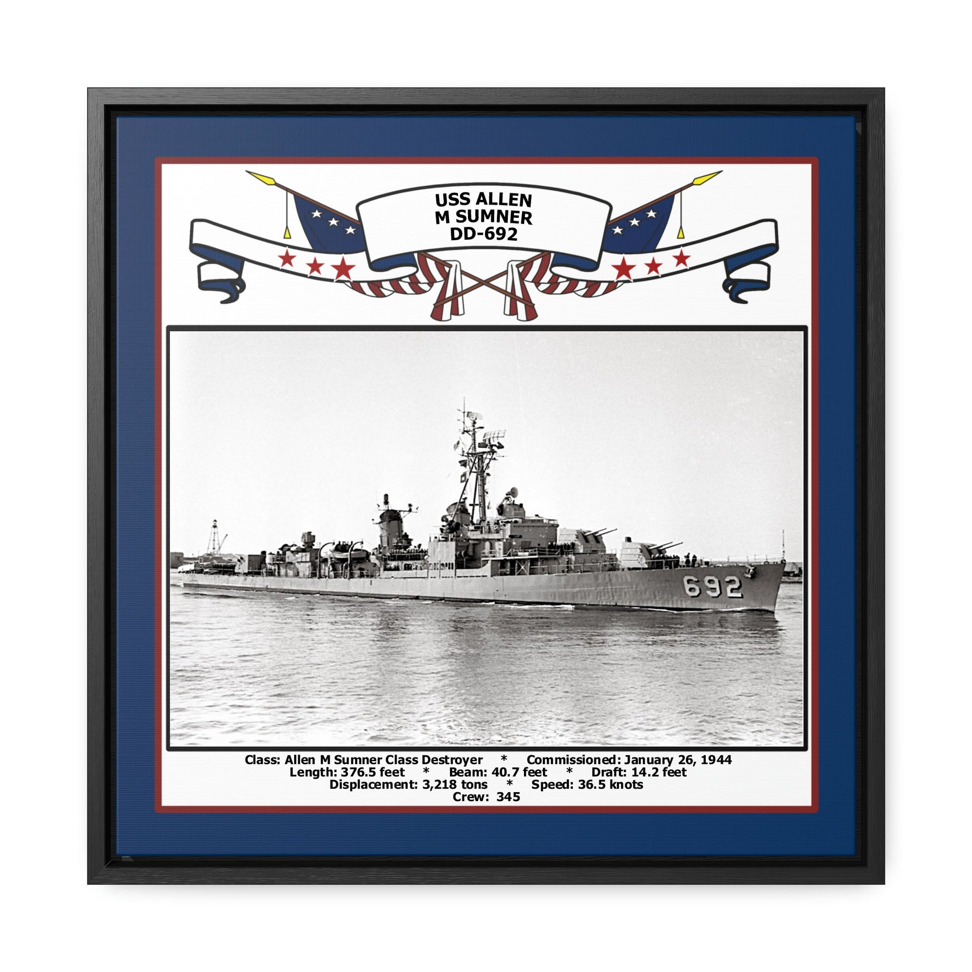 Your Navy Veteran will love this 16 x 16 inch canvas photo print of the USS Allen M Sumner DD-692. This print is richly displayed in a black floating frame. Available with a printed blue border color.