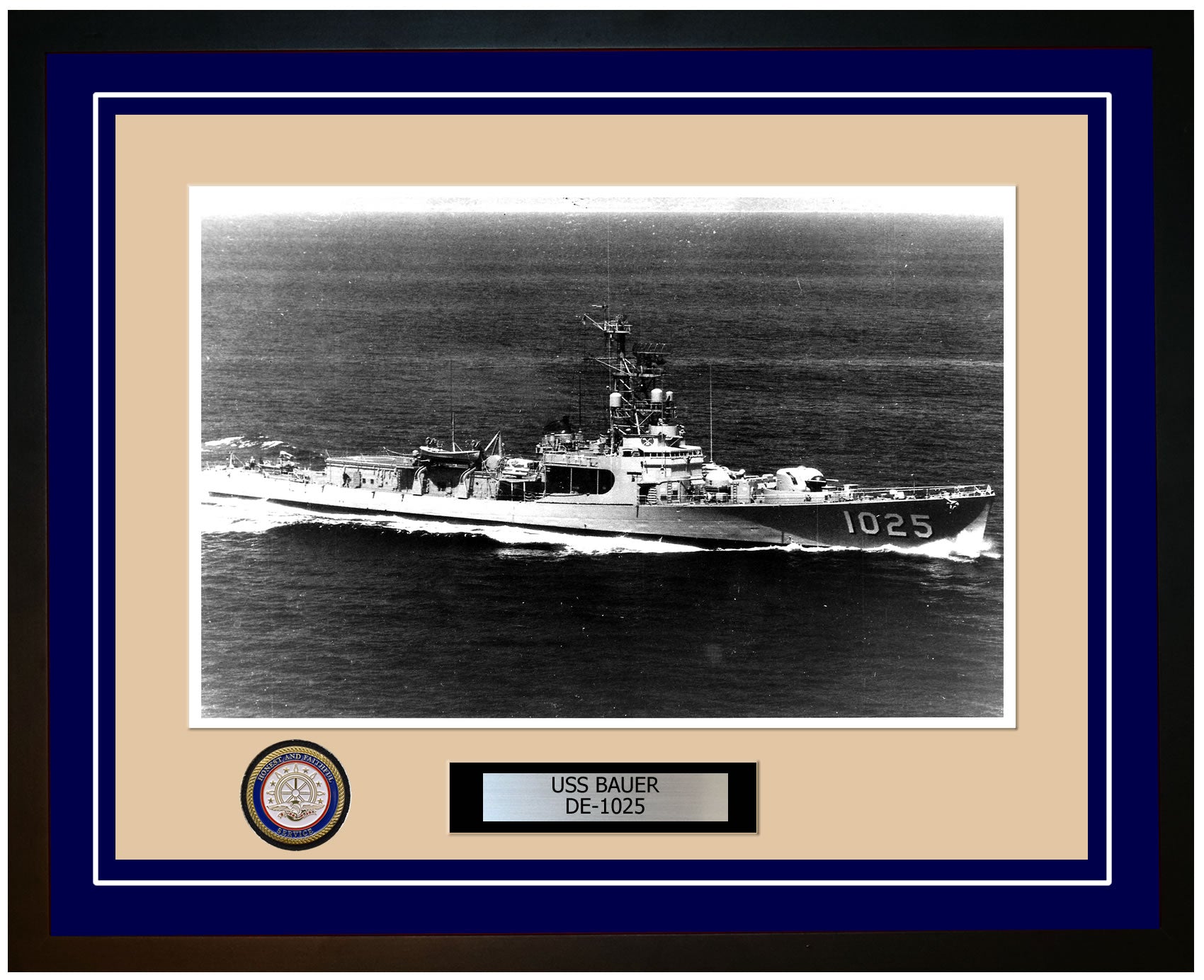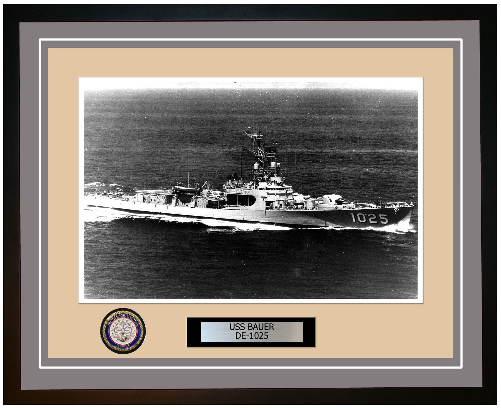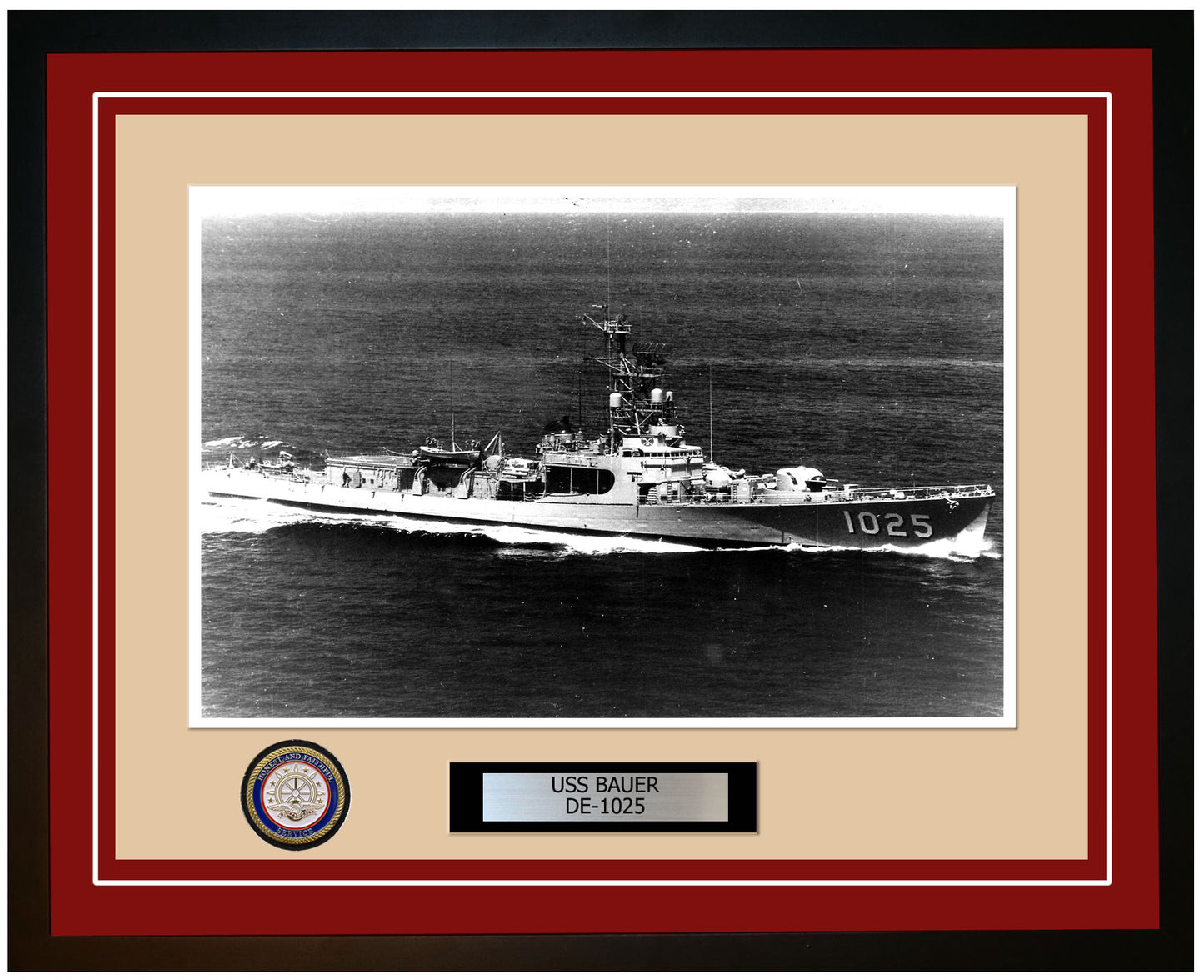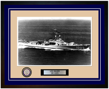 This photo of the USS Bauer (DE-1025) is framed and double matted with the highest quality construction in mind. The ship name and designation is engraved on chrome engraving stock and set on a beautiful felt backing. All this set in a custom cut fine inner mat and your choice of colors for the outer mat. The v-groove in the outer mat and custom engraving add high quality details that properly honor all the service members who served on this fine ship.