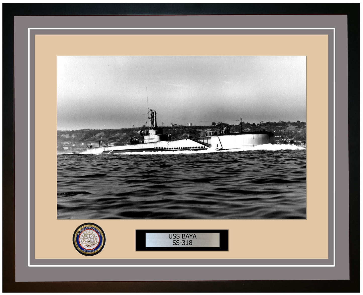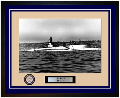 This photo of the USS Baya SS 318 is framed and double matted with the highest quality construction in mind. The ship name and designation is engraved on chrome engraving stock and set on a beautiful felt backing. All this set in a custom cut fine inner mat and your choice of colors for the outer mat. The v-groove in the outer mat and custom engraving add high quality details that properly honor all the service members who served on this fine ship.