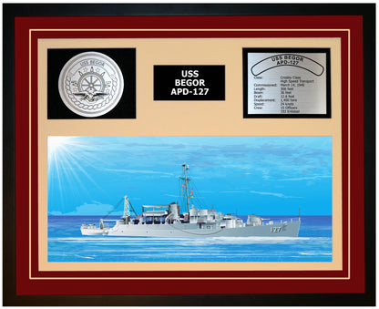 This is a beautiful ship display commemorating the USS BEGOR (APD-127). The artwork depicts the USS BEGOR in all her glory. More than just an artistic concept of the ship, this display includes a custom designed ship crest plaque and an engraved ship statistics plaque. This product is richly finished with custom cut and sized double mats and framed with a high quality black frame. Only the best materials are used to complete our ship displays. Navy Emporium Ship Displays make a generous and personal gift for any Navy sailor.