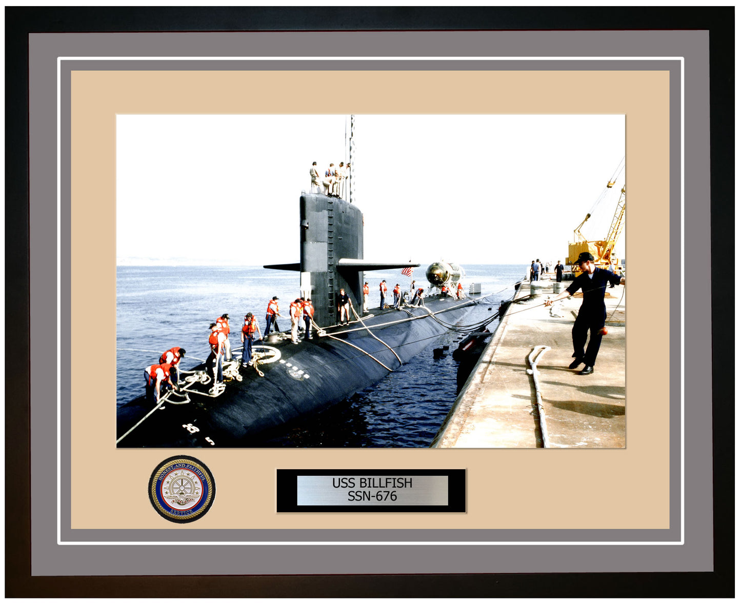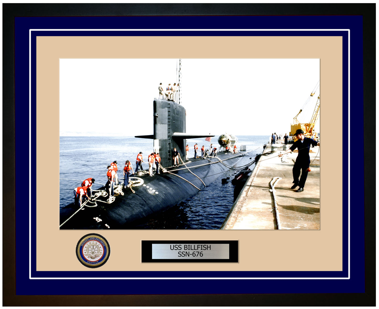 This photo of the USS Billfish SSN 676 is framed and double matted with the highest quality construction in mind. The ship name and designation is engraved on chrome engraving stock and set on a beautiful felt backing. All this set in a custom cut fine inner mat and your choice of colors for the outer mat. The v-groove in the outer mat and custom engraving add high quality details that properly honor all the service members who served on this fine ship.