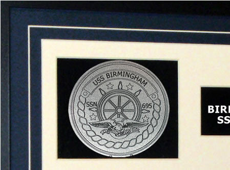 a beautiful ship display commemorating the USS Birmingham (SSN695) and all those who served aboard. The artwork depicts the USS Birmingham in all her glory. The display features not a photograph, but an artist's creation of the ship as well as an engraved custom US Navy plaque and an engraved ship's statistics plaque. This product is richly finished with custom cut and sized double mats and framed with a high quality black frame. Only the best materials are used to complete our ship displays. Navy Emporium's Ship Displays make a generous and personal gift for any Navy sailor.