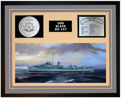 This is a beautiful ship display commemorating the USS BLAIR (DE-147). The artwork depicts the USS BLAIR in all her glory. More than just an artistic concept of the ship, this display includes a custom designed ship crest plaque and an engraved ship statistics plaque. This product is richly finished with custom cut and sized double mats and framed with a high quality black frame. Only the best materials are used to complete our ship displays. Navy Emporium Ship Displays make a generous and personal gift for any Navy sailor.