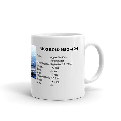 Celebrate your Navy pride with this USS BOLD MSO-424 Coffee Mug. Pictured is custom art of your ship! Whether you're drinking your morning coffee, evening tea, or something in between “ this mug's for you! It's sturdy and glossy with a vivid print that'll withstand the microwave and dishwasher.