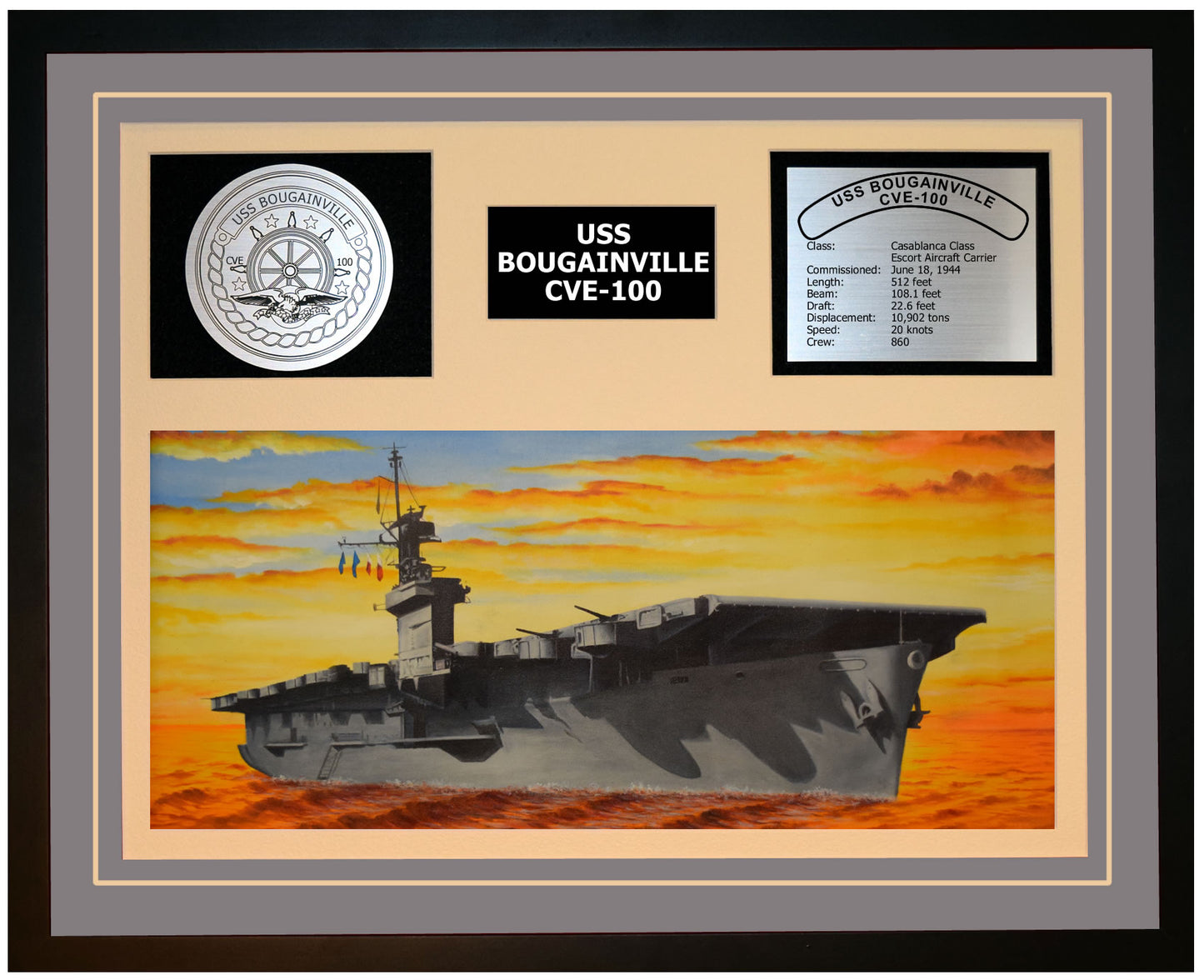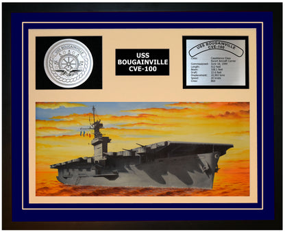 This is a beautiful ship display commemorating the USS BOUGAINVILLE (CVE-100). The artwork depicts the USS BOUGAINVILLE in all her glory. More than just an artistic concept of the ship, this display includes a custom designed ship crest plaque and an engraved ship statistics plaque. This product is richly finished with custom cut and sized double mats and framed with a high quality black frame. Only the best materials are used to complete our ship displays. Navy Emporium Ship Displays make a generous and personal gift for any Navy sailor. in all her glory. More than just an artistic concept of the ship, this display includes a custom designed ship crest plaque and an engraved ship statistics plaque. This product is richly finished with custom cut and sized double mats and framed with a high quality black frame. Only the best materials are used to complete our ship displays. Navy Emporium Ship Displays make a generous and personal gift for any Navy sailor.
