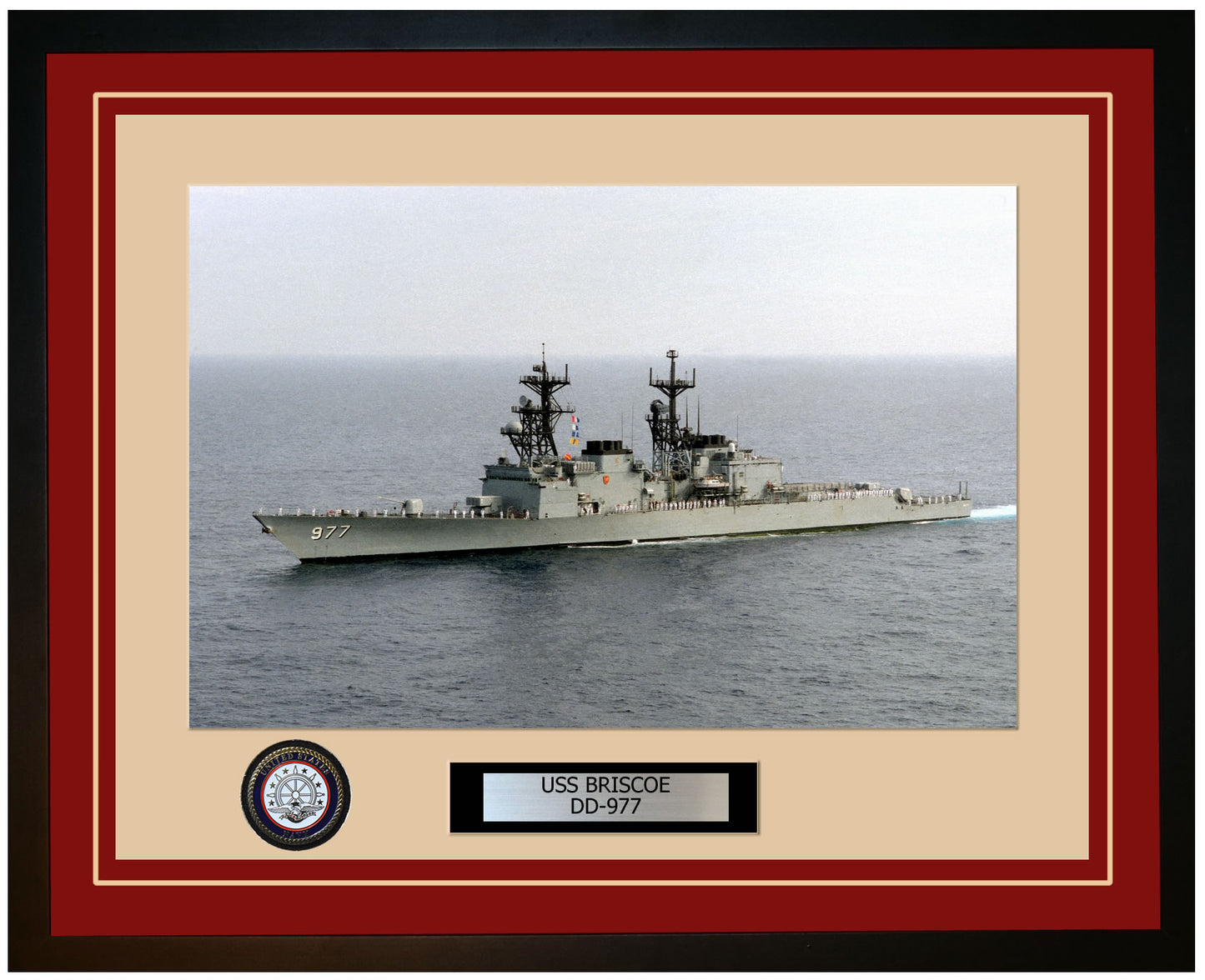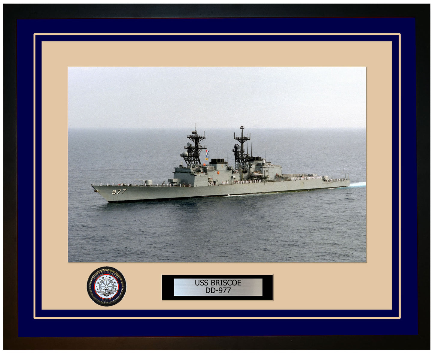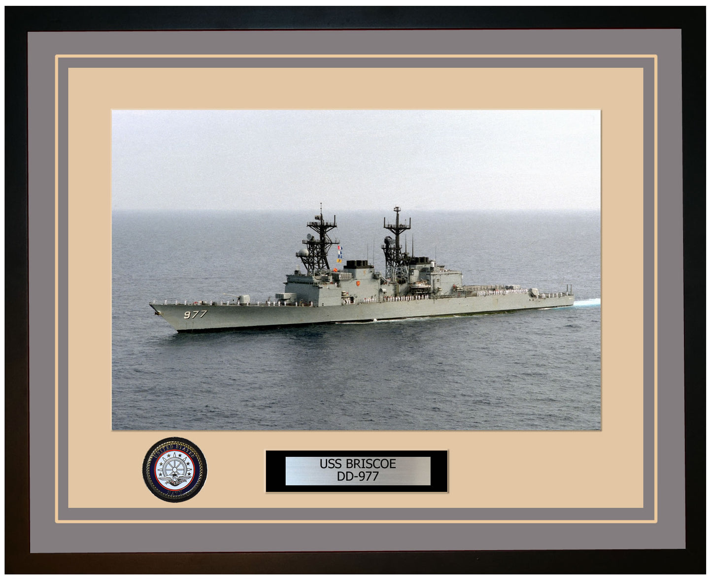 This photo of the USS BRISCOE (DD-977) is framed and double matted with the highest quality construction in mind. The ship name and designation is engraved on chrome engraving stock and set on a beautiful felt backing. All this set in a custom cut fine inner mat and your choice of colors for the outer mat. The v-groove in the outer mat and custom engraving add high quality details that properly honor all the service members who served on this fine ship.