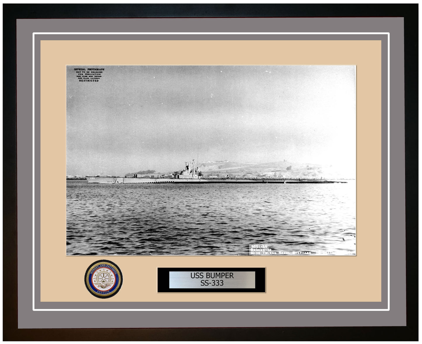 This photo of the USS Bumper SS 333 is framed and double matted with the highest quality construction in mind. The ship name and designation is engraved on chrome engraving stock and set on a beautiful felt backing. All this set in a custom cut fine inner mat and your choice of colors for the outer mat. The v-groove in the outer mat and custom engraving add high quality details that properly honor all the service members who served on this fine ship.