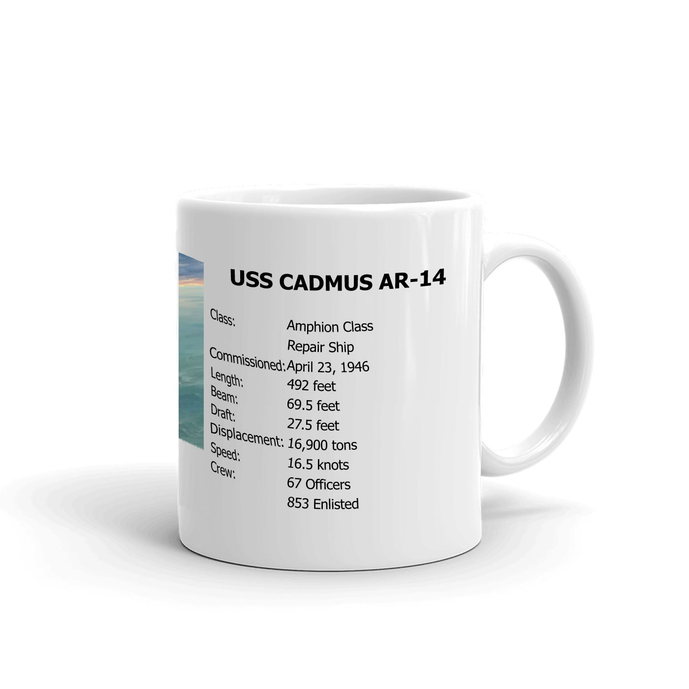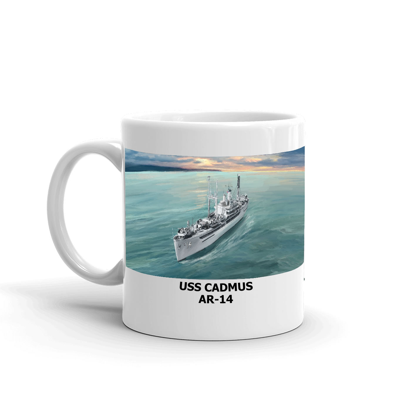 Celebrate your Navy pride with this USS CADMUS AR-14 Coffee Mug. Pictured is custom art of your ship! Whether you're drinking your morning coffee, evening tea, or something in between “ this mug's for you! It's sturdy and glossy with a vivid print that'll withstand the microwave and dishwasher.