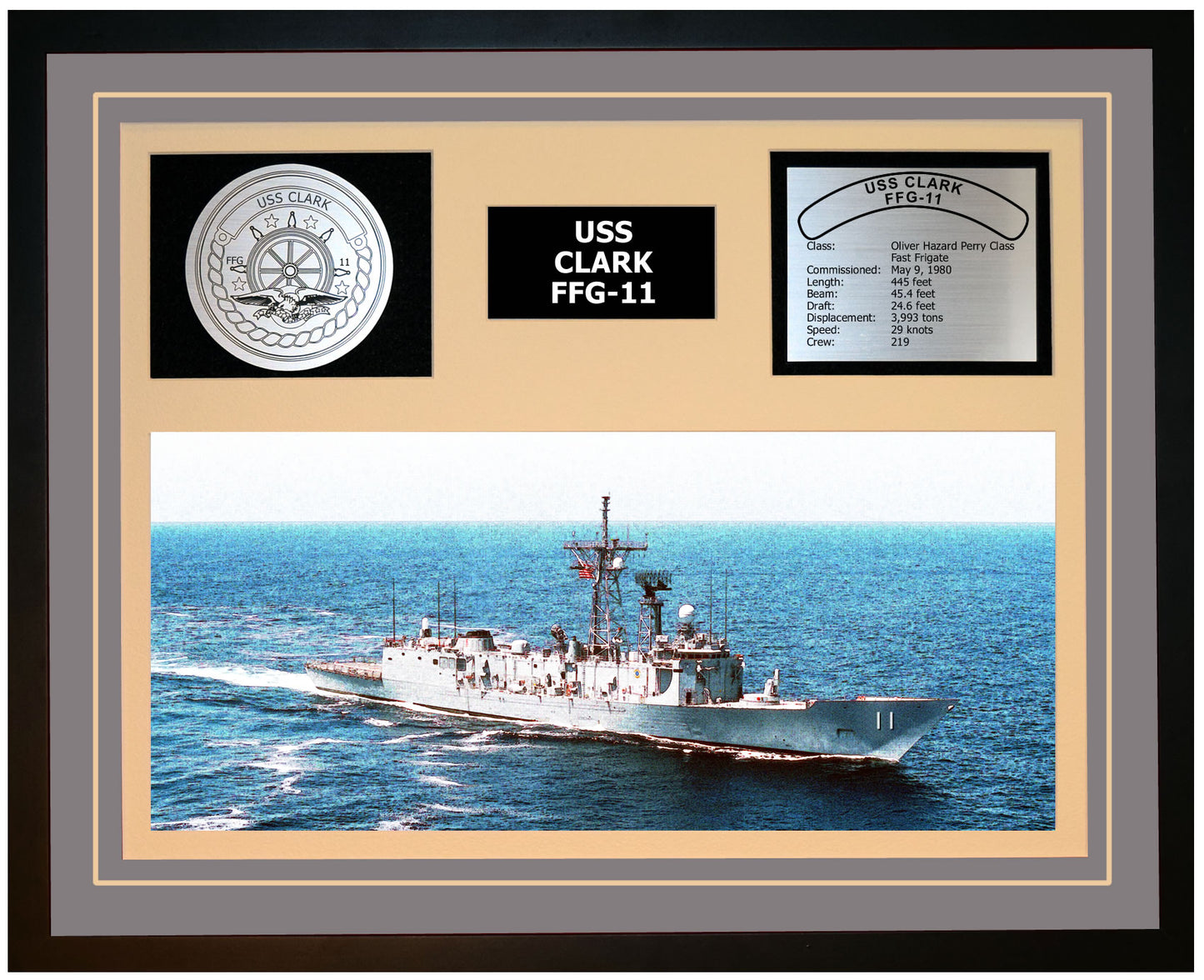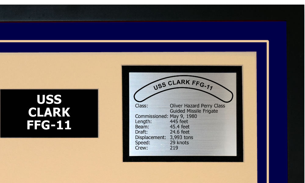 This is a beautiful ship display commemorating the USS CLARK (FFG-11). The artwork depicts the USS CLARK in all her glory. More than just an artistic concept of the ship, this display includes a custom designed ship crest plaque and an engraved ship statistics plaque. This product is richly finished with custom cut and sized double mats and framed with a high quality black frame. Only the best materials are used to complete our ship displays. Navy Emporium Ship Displays make a generous and personal gift for any Navy sailor.