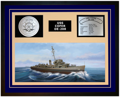 This is a beautiful ship display commemorating the USS COFER (DE-208). The artwork depicts the USS COFER in all her glory. More than just an artistic concept of the ship, this display includes a custom designed ship crest plaque and an engraved ship statistics plaque. This product is richly finished with custom cut and sized double mats and framed with a high quality black frame. Only the best materials are used to complete our ship displays. Navy Emporium Ship Displays make a generous and personal gift for any Navy sailor.