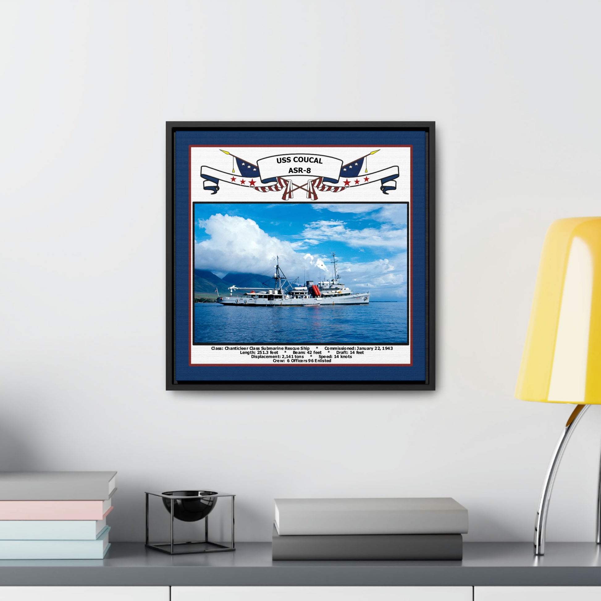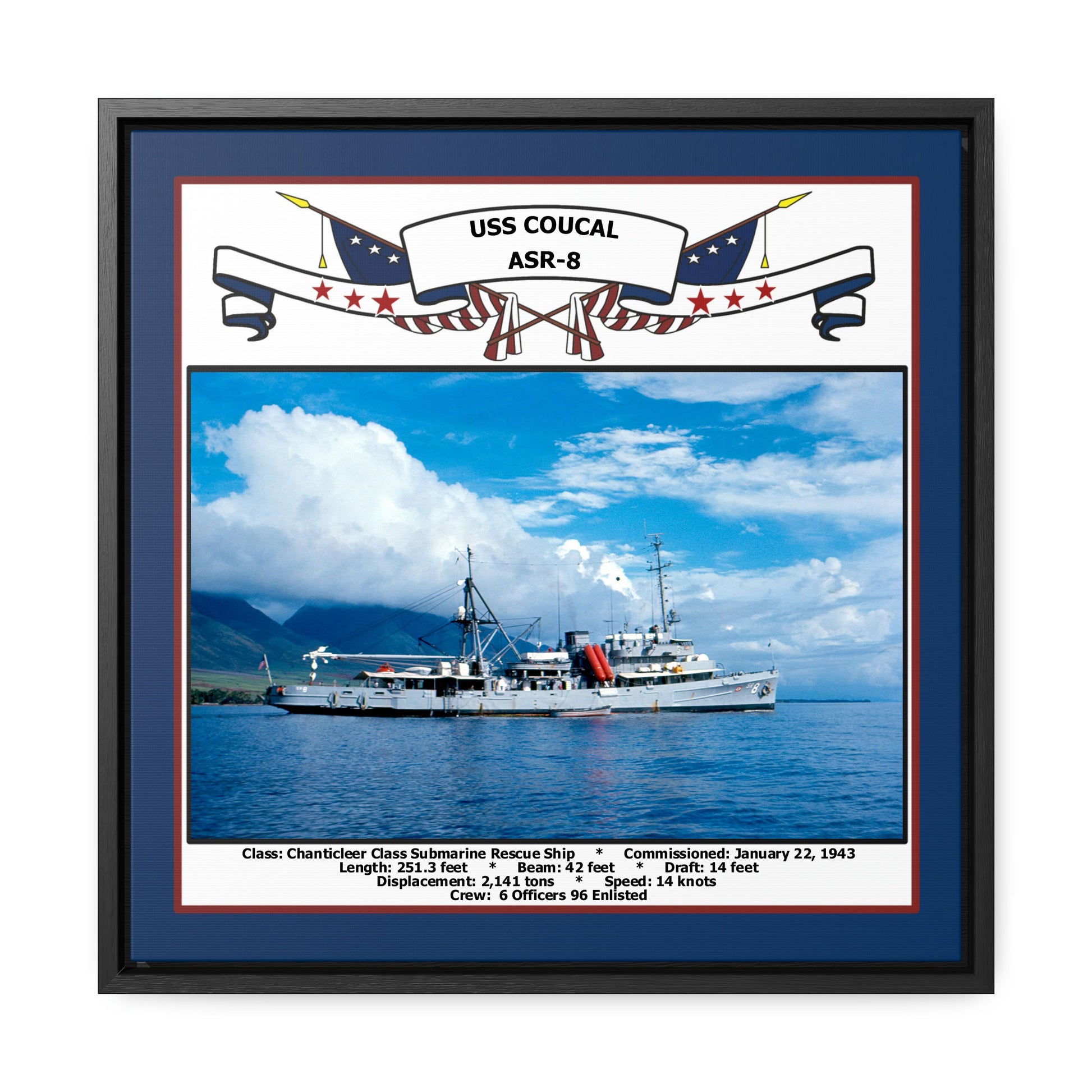 Your Navy Veteran will love this 16 x 16 inch canvas photo print of the USS Coucal ASR-8. This print is richly displayed in a black floating frame. Available with a printed blue border color.