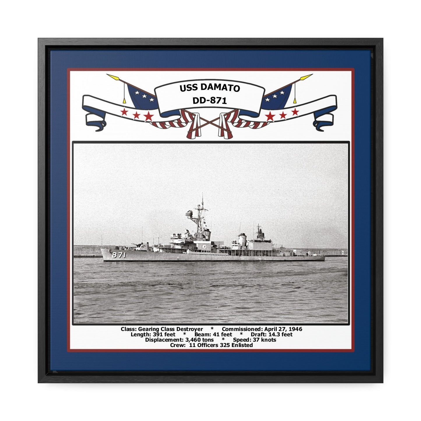 Your Navy Veteran will love this 16 x 16 inch canvas photo print of the USS Damato DD-871. This print is richly displayed in a black floating frame. Available with a printed blue border color.