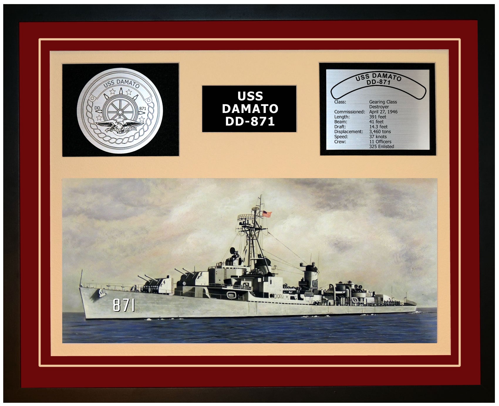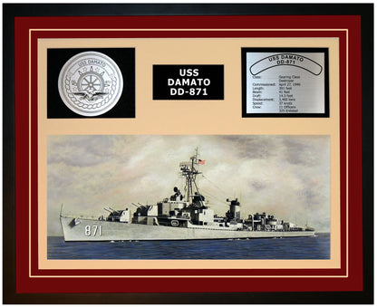 This is a beautiful ship display commemorating the USS DAMATO (DD-871). The artwork depicts the USS DAMATO in all her glory. More than just an artistic concept of the ship, this display includes a custom designed ship crest plaque and an engraved ship statistics plaque. This product is richly finished with custom cut and sized double mats and framed with a high quality black frame. Only the best materials are used to complete our ship displays. Navy Emporium Ship Displays make a generous and personal gift for any Navy sailor.