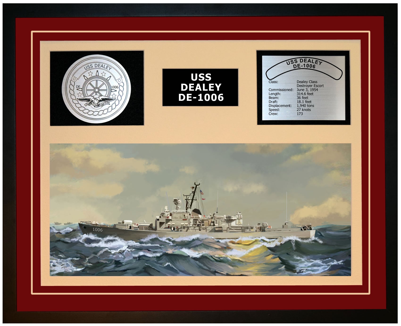 This is a beautiful ship display commemorating the USS DEALEY (DE-1006). The artwork depicts the USS DEALEY in all her glory. More than just an artistic concept of the ship, this display includes a custom designed ship crest plaque and an engraved ship statistics plaque. This product is richly finished with custom cut and sized double mats and framed with a high quality black frame. Only the best materials are used to complete our ship displays. Navy Emporium Ship Displays make a generous and personal gift for any Navy sailor.