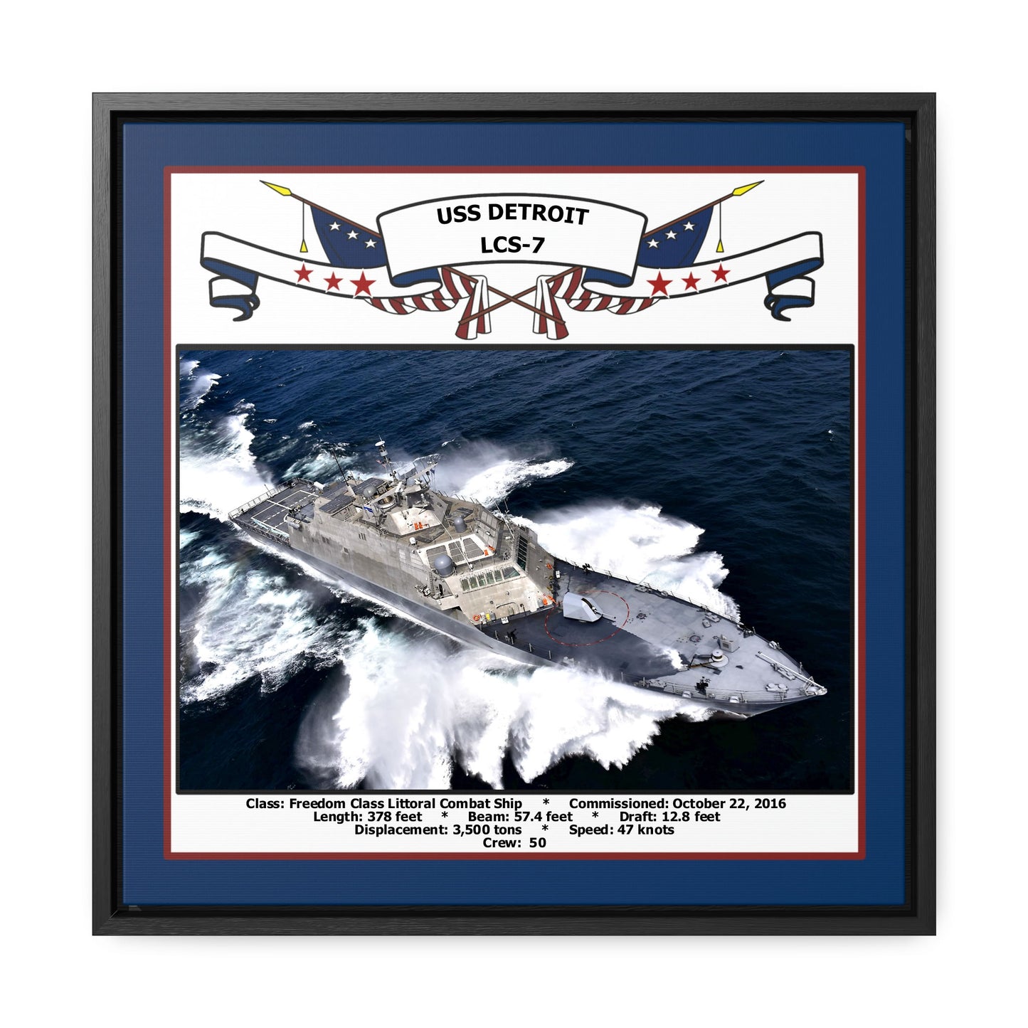 Your Navy Veteran will love this 16 x 16 inch canvas photo print of the USS Detroit LCS-7. This print is richly displayed in a black floating frame. Available with a printed blue border color.