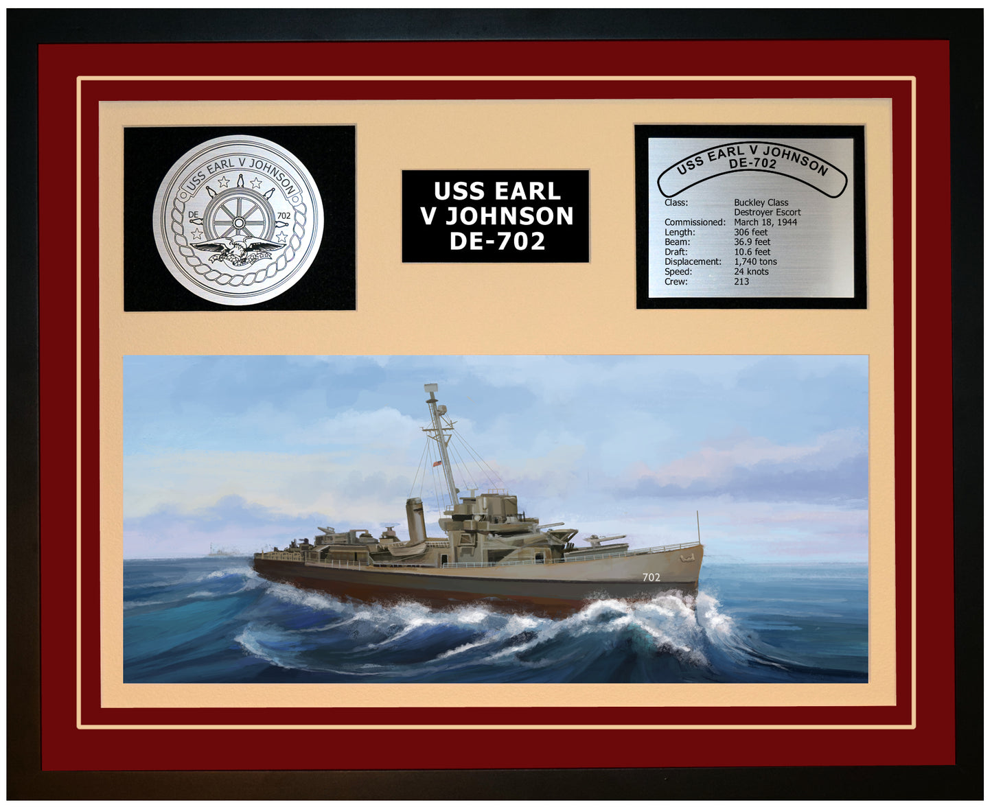 This is a beautiful ship display commemorating the USS EARL V JOHNSON (DE-702). The artwork depicts the USS EARL V JOHNSON in all her glory. More than just an artistic concept of the ship, this display includes a custom designed ship crest plaque and an engraved ship statistics plaque. This product is richly finished with custom cut and sized double mats and framed with a high quality black frame. Only the best materials are used to complete our ship displays. Navy Emporium Ship Displays make a generous and personal gift for any Navy sailor.