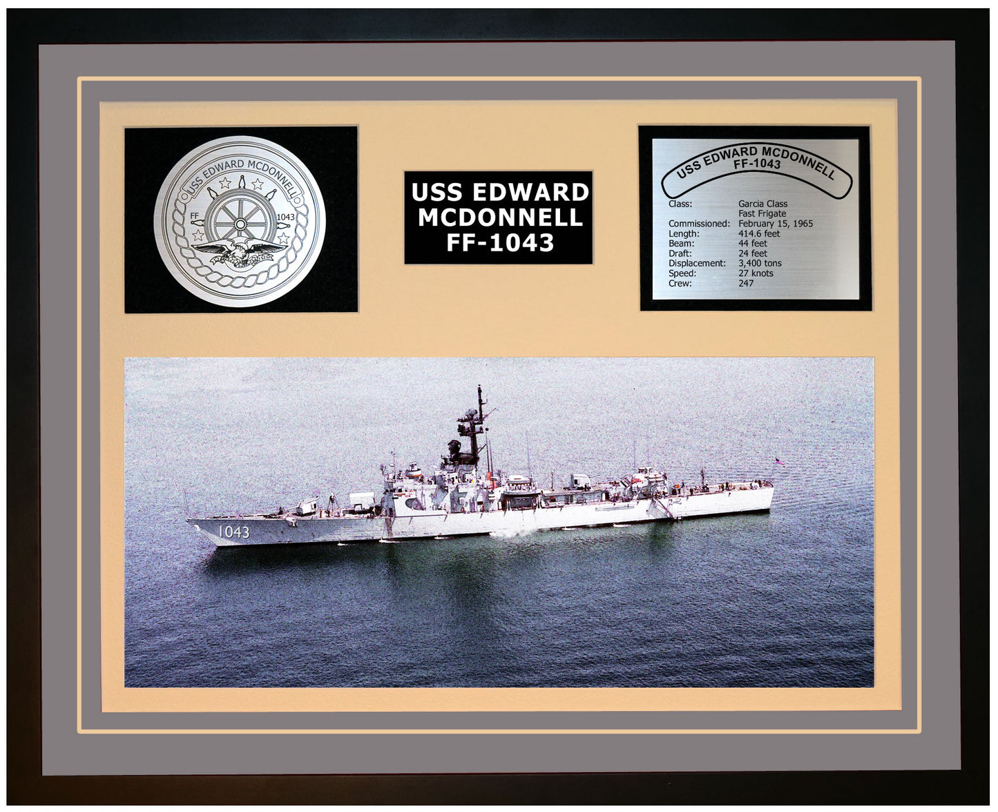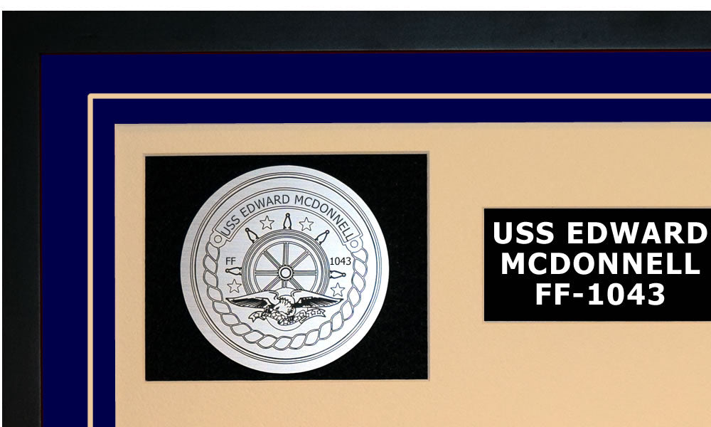 This is a beautiful ship display commemorating the USS EDWARD MCDONNELL (FF-1043). The artwork depicts the USS EDWARD MCDONNELL in all her glory. More than just an artistic concept of the ship, this display includes a custom designed ship crest plaque and an engraved ship statistics plaque. This product is richly finished with custom cut and sized double mats and framed with a high quality black frame. Only the best materials are used to complete our ship displays. Navy Emporium Ship Displays make a generous and personal gift for any Navy sailor.