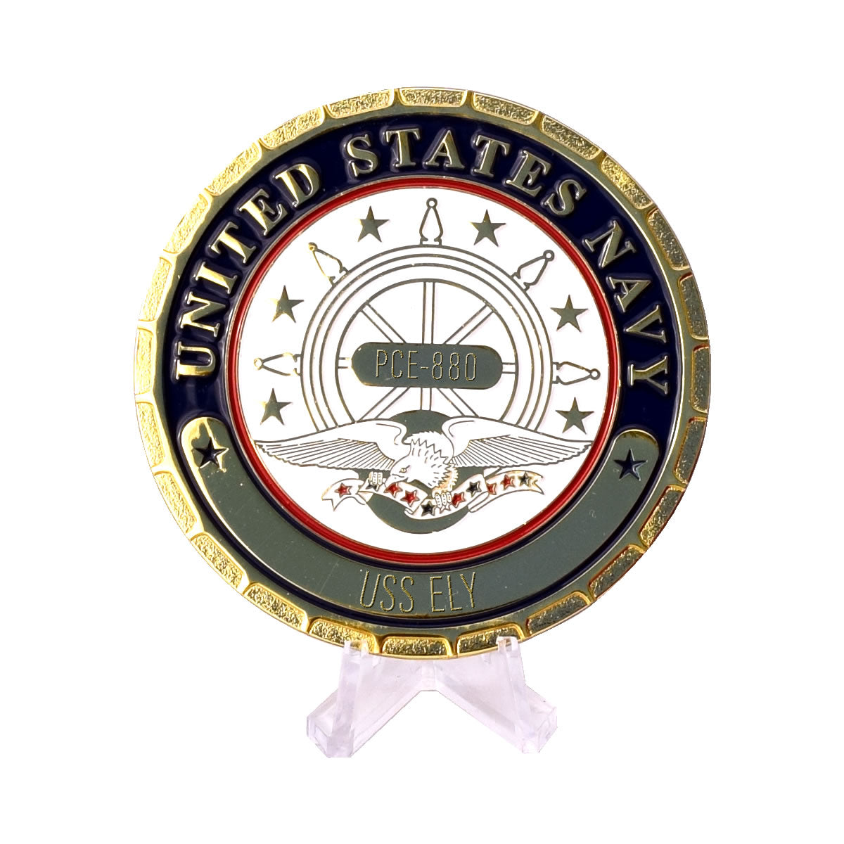 Display your Navy pride for all to see with the personalized USS Ely (PCE-880) Navy Ship Plaque. We are offering this premium metal plaque measuring 3" in diameter and includes an acrylic stand, high quality quilted gift box, and up to three lines of engraved personalization! Show your pride in the USS Ely and your proud contribution to the freedom of our nation!