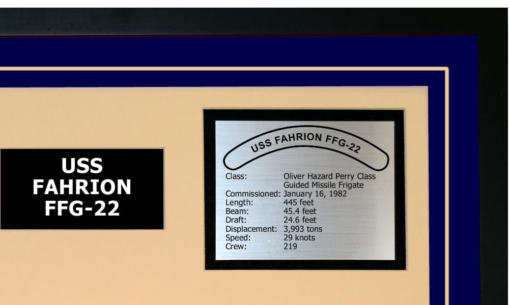 This is a beautiful ship display commemorating the USS FAHRION (FFG-22). The artwork depicts the USS FAHRION in all her glory. More than just an artistic concept of the ship, this display includes a custom designed ship crest plaque and an engraved ship statistics plaque. This product is richly finished with custom cut and sized double mats and framed with a high quality black frame. Only the best materials are used to complete our ship displays. Navy Emporium Ship Displays make a generous and personal gift for any Navy sailor.