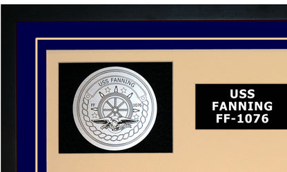 This is a beautiful ship display commemorating the USS FANNING (FF-1076). The artwork depicts the USS FANNING in all her glory. More than just an artistic concept of the ship, this display includes a custom designed ship crest plaque and an engraved ship statistics plaque. This product is richly finished with custom cut and sized double mats and framed with a high quality black frame. Only the best materials are used to complete our ship displays. Navy Emporium Ship Displays make a generous and personal gift for any Navy sailor. in all her glory. More than just an artistic concept of the ship, this display includes a custom designed ship crest plaque and an engraved ship statistics plaque. This product is richly finished with custom cut and sized double mats and framed with a high quality black frame. Only the best materials are used to complete our ship displays. Navy Emporium Ship Displays make a generous and personal gift for any Navy sailor.