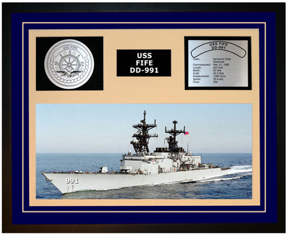 This is a beautiful ship display commemorating the USS FIFE (DD-991). The artwork depicts the USS FIFE in all her glory. More than just an artistic concept of the ship, this display includes a custom designed ship crest plaque and an engraved ship statistics plaque. This product is richly finished with custom cut and sized double mats and framed with a high quality black frame. Only the best materials are used to complete our ship displays. Navy Emporium Ship Displays make a generous and personal gift for any Navy sailor.