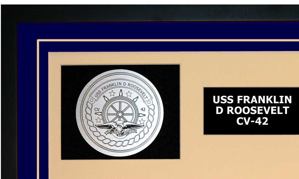 This is a beautiful ship display commemorating the USS FRANKLIN D ROOSEVELT (CV-42). The photograph depicts the USS FRANKLIN D ROOSEVELT in all her glory. The display features a photograph of the ship as well as a custom designed ship crest plaque and an engraved ship statistics plaque. This product is richly finished with custom cut and sized double mats and framed with a high quality black frame. Only the best materials are used to complete our ship displays. Navy Emporium Ship Displays make a generous and personal gift for any Navy sailor. in all her glory. The display features a photograph of the ship as well as a custom designed ship crest plaque and an engraved ship statistics plaque. This product is richly finished with custom cut and sized double mats and framed with a high quality black frame. Only the best materials are used to complete our ship displays. Navy Emporium Ship Displays make a generous and personal gift for any Navy sailor.