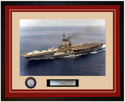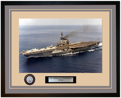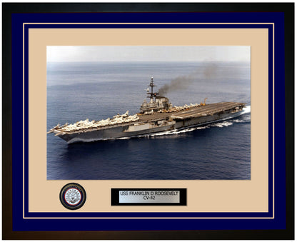 This photo of the USS FRANKLIN D ROOSEVELT (CV-42) is framed and double matted with the highest quality construction in mind. The ship name and designation is engraved on chrome engraving stock and set on a beautiful felt backing. All this set in a custom cut fine inner mat and your choice of colors for the outer mat. The v-groove in the outer mat and custom engraving add high quality details that properly honor all the service members who served on this fine ship.
