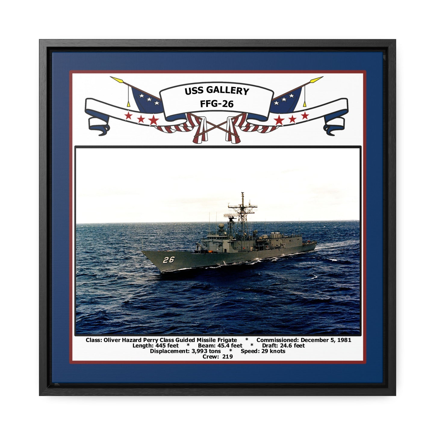 Your Navy Veteran will love this 16 x 16 inch canvas photo print of the USS Gallery FFG-26. This print is richly displayed in a black floating frame. Available with a printed blue border color.