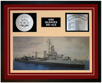 This is a beautiful ship display commemorating the USS GLEAVES (DD-423). The artwork depicts the USS GLEAVES in all her glory. More than just an artistic concept of the ship, this display includes a custom designed ship crest plaque and an engraved ship statistics plaque. This product is richly finished with custom cut and sized double mats and framed with a high quality black frame. Only the best materials are used to complete our ship displays. Navy Emporium Ship Displays make a generous and personal gift for any Navy sailor.