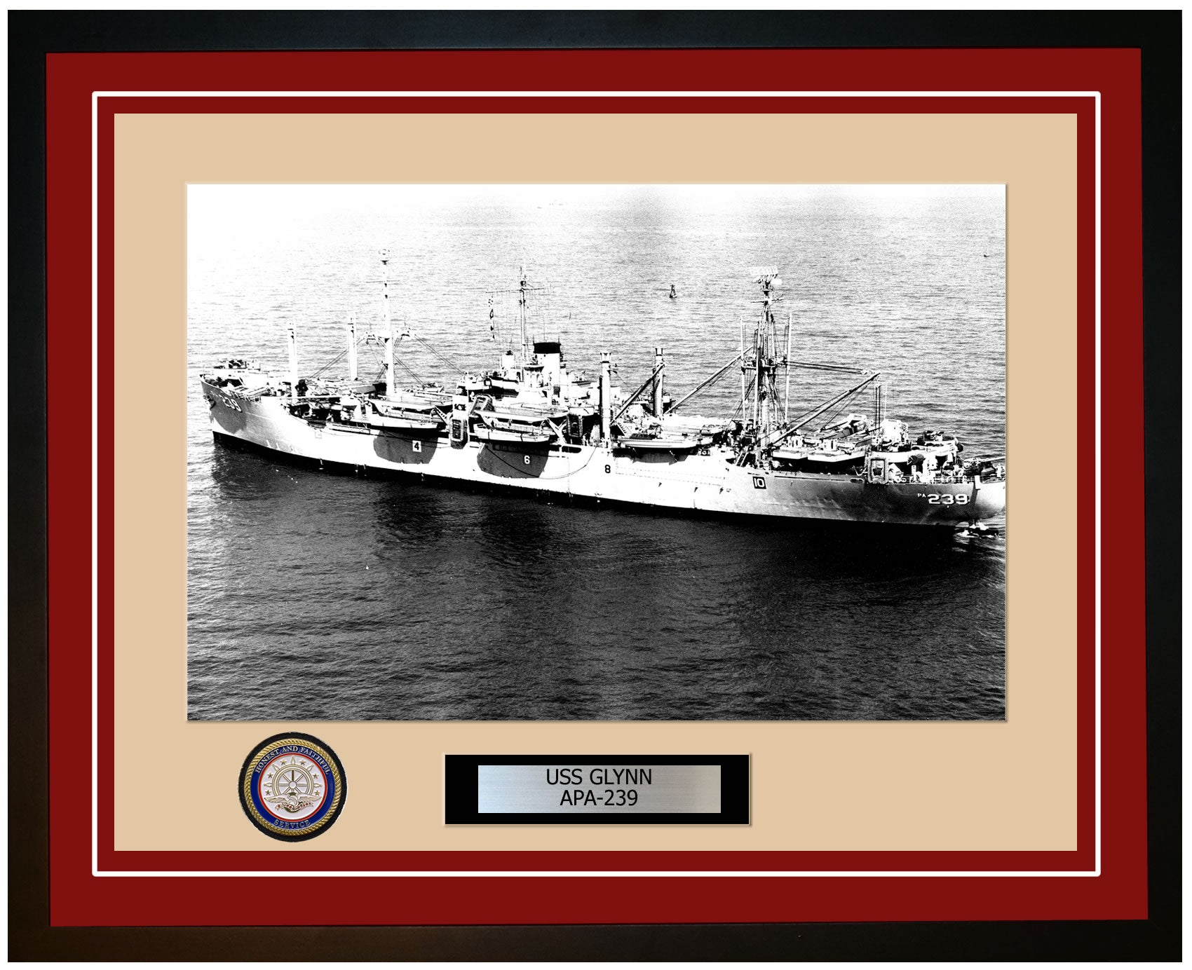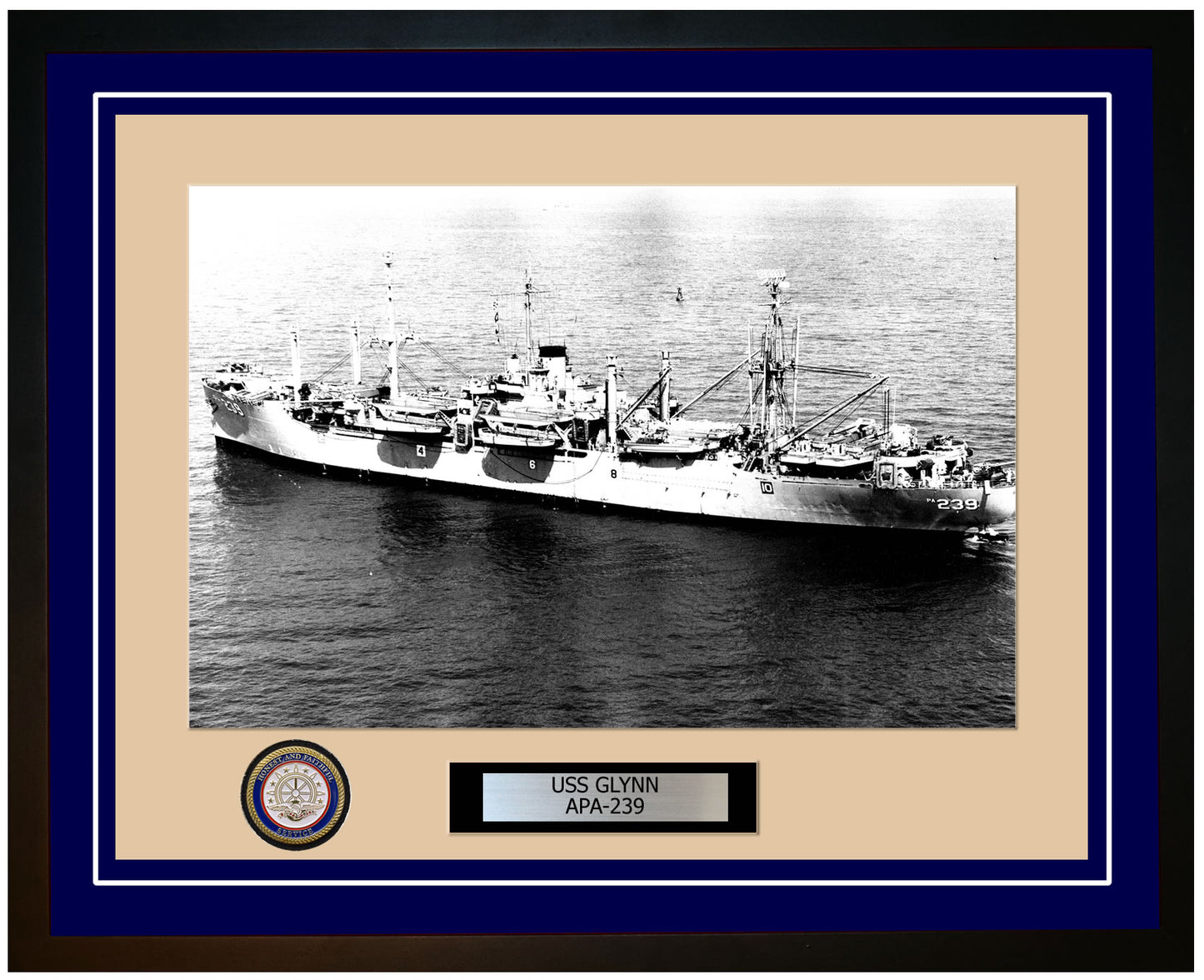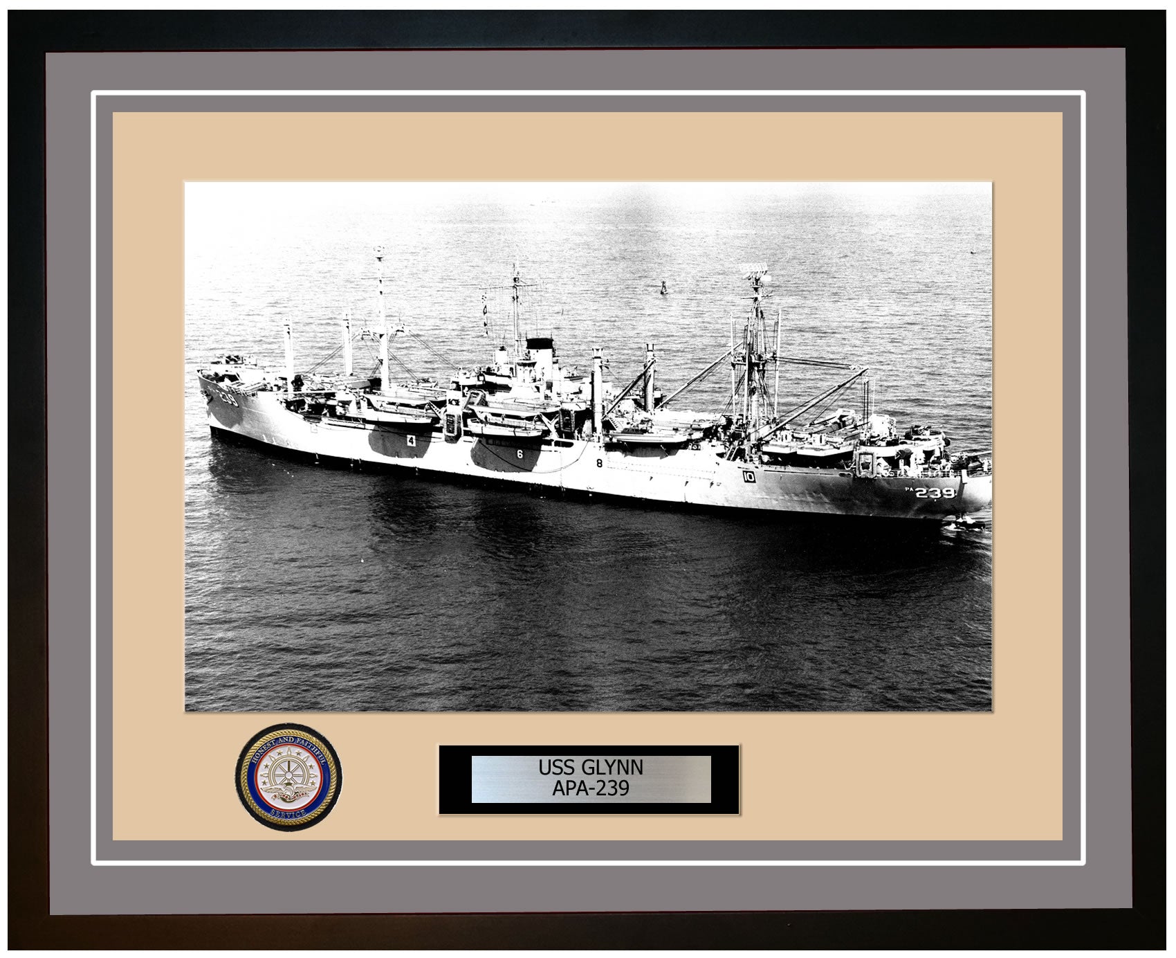 This photo of the USS Glynn (APA-239) is framed and double matted with the highest quality construction in mind. The ship name and designation is engraved on chrome engraving stock and set on a beautiful felt backing. All this set in a custom cut fine inner mat and your choice of colors for the outer mat. The v-groove in the outer mat and custom engraving add high quality details that properly honor all the service members who served on this fine ship.