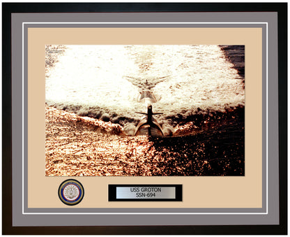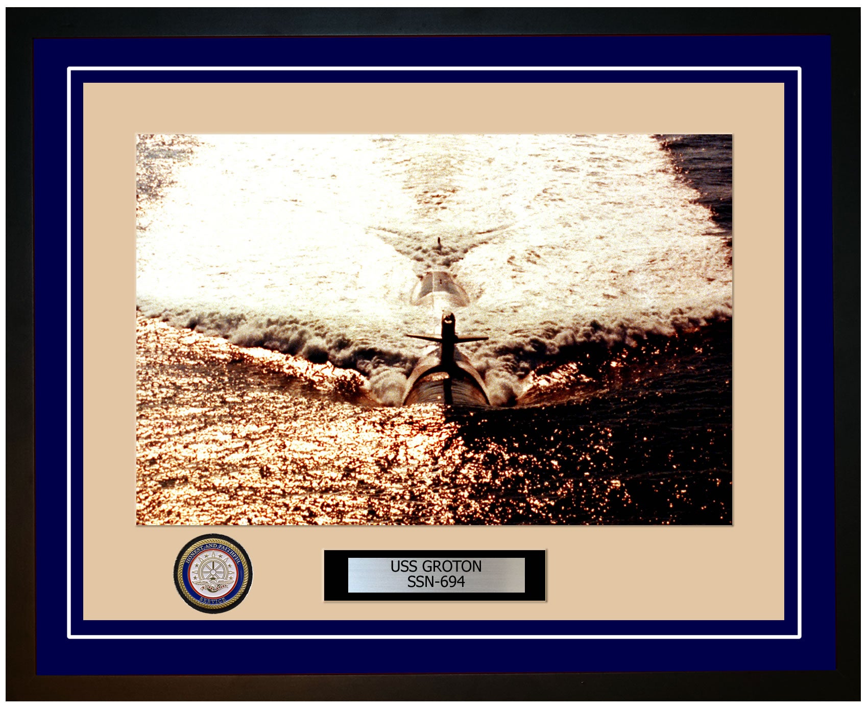 This photo of the USS Groton SSN 694 is framed and double matted with the highest quality construction in mind. The ship name and designation is engraved on chrome engraving stock and set on a beautiful felt backing. All this set in a custom cut fine inner mat and your choice of colors for the outer mat. The v-groove in the outer mat and custom engraving add high quality details that properly honor all the service members who served on this fine ship.